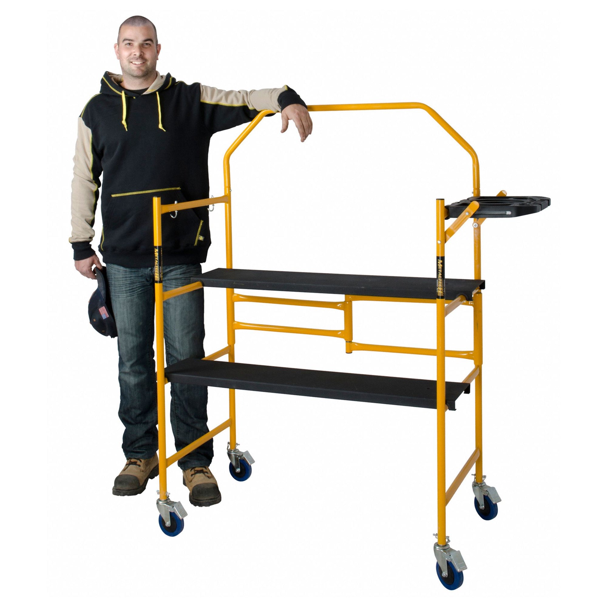 This Jobsite Series folding steel scaffold platform is a great solution for a mobile work surface. It features a 500-pound load capacity, yet it is extremely lightweight and folds for added portability. It's constructed with a 1-inch steel tube frame, 4-inch swivel casters with locking brakes, and a solid steel stem. Its multi-level working area is adjustable so you can set them at your desired level for a comfortable workplace. This series features a safety rail to hold on to for added stability and a convenient fold-away tool shelf for your paint can, bucket, screws, nails, and tools. When you're ready to call it a day, this bench folds flat for compact storage and transport.