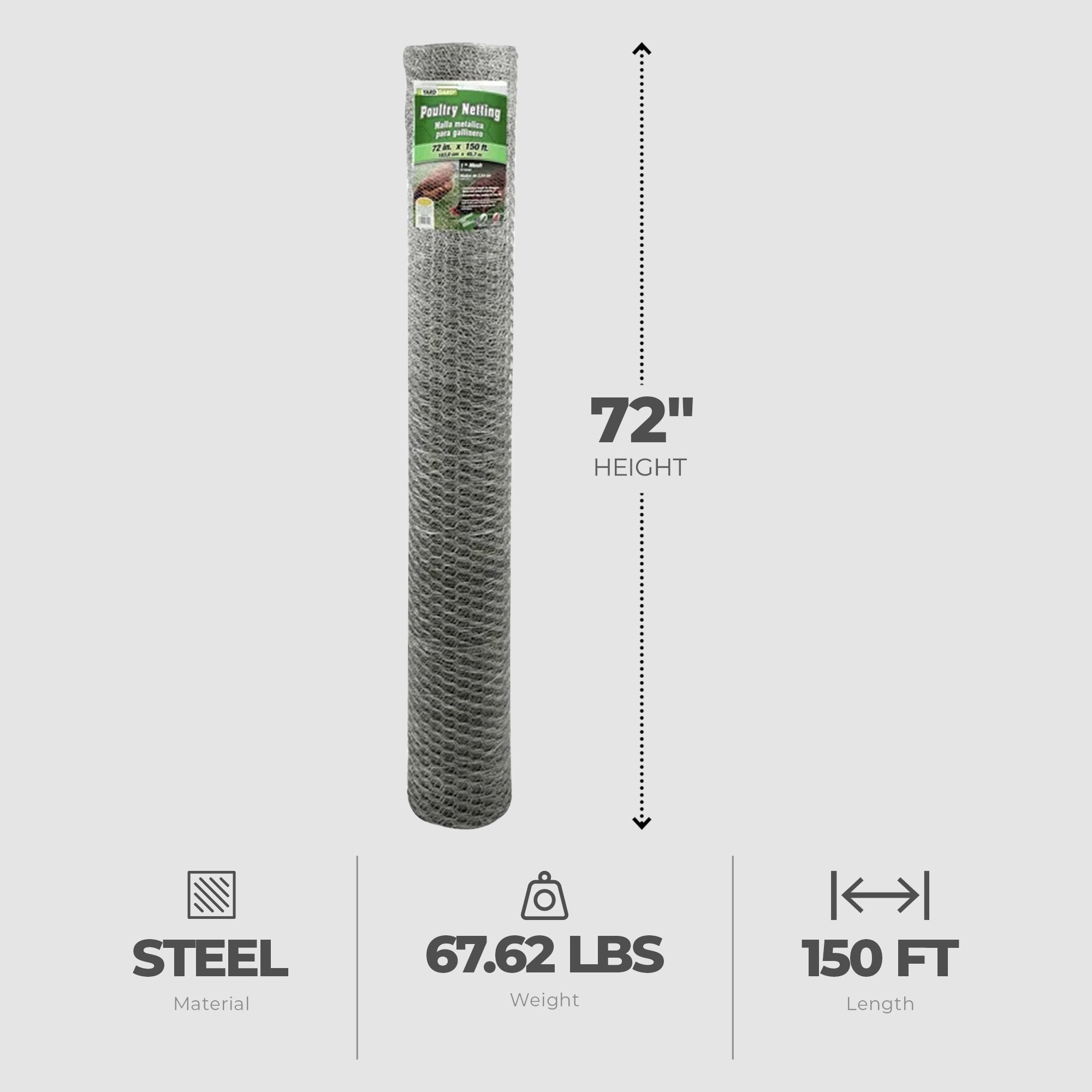 This fencing solution is meticulously engineered to redefine the standards of strength and aesthetics. Standing at an impressive 72 inches in height, this chicken wire presents an imposing barrier that safeguards your space with unwavering resilience. The 150-foot length of this poultry fencing ensures extensive coverage, making this mesh wire an ideal choice for diverse applications, whether you're securing a residential haven, a commercial space, or an industrial facility. Featuring galvanized steel gauge construction, this wire fencing provides unparalleled durability and resistance against the elements. Say goodbye to worries about rust and corrosion as this poultry net is built to withstand the test of time. Also, its sleek and modern aesthetic seamlessly integrates into any environment, enhancing the overall visual appeal of your property. This poultry netting doesn't just provide security, but it also adds a touch of sophistication to your surroundings.