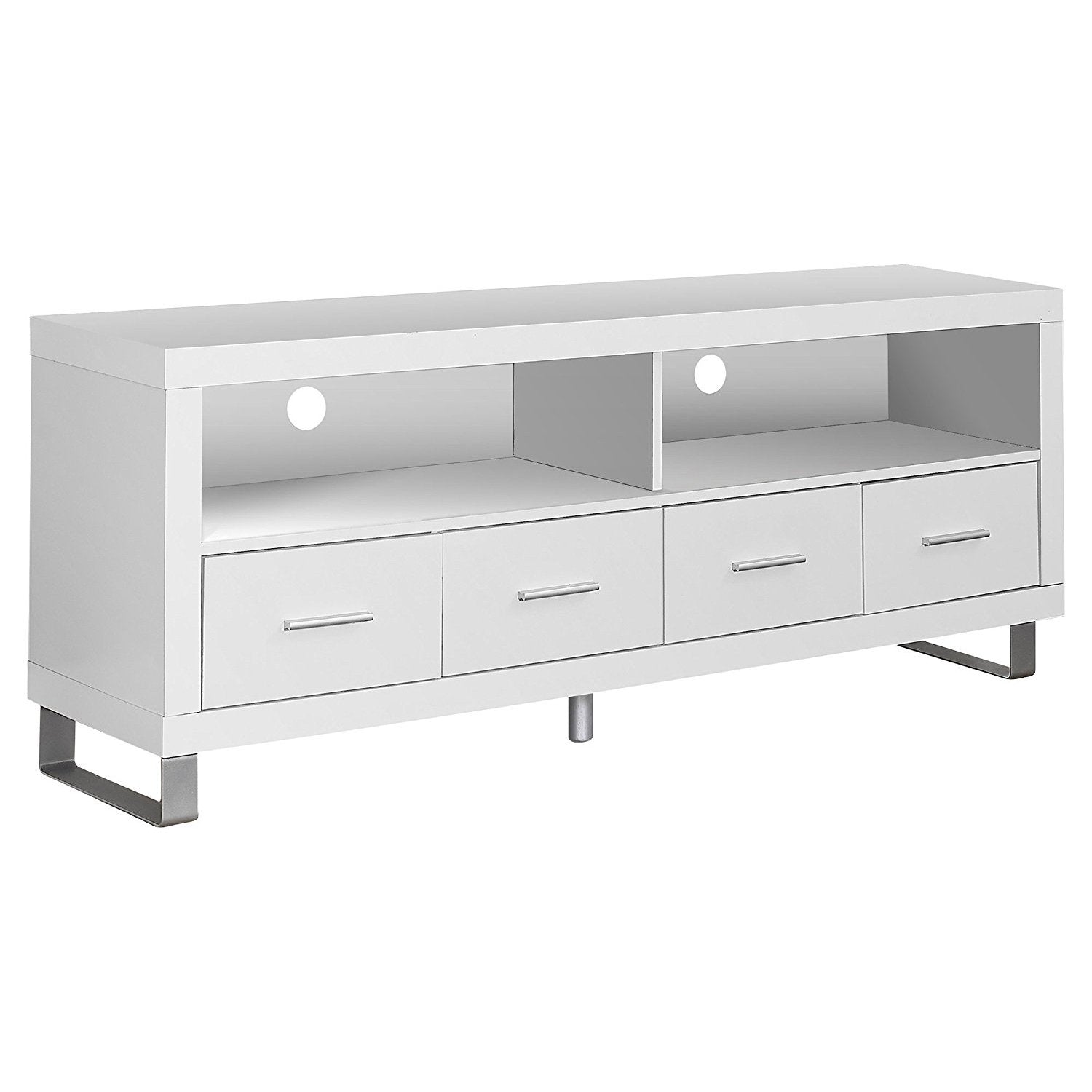 Complete your home decor with the simple contemporary elegance of this bright white TV console. Comes with 2 entertainment centers total.