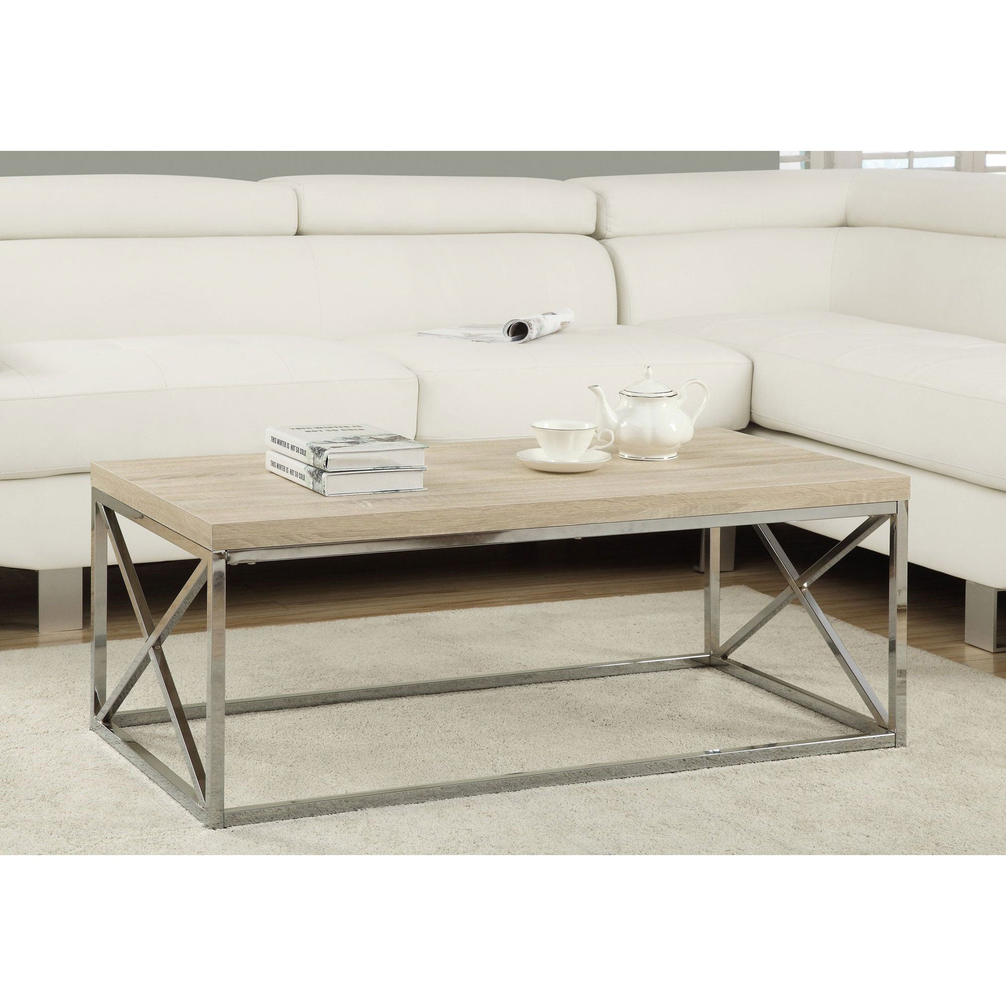 Monarch Natural Wood-Look Finish Chrome Metal Contemporary Design Coffee Table