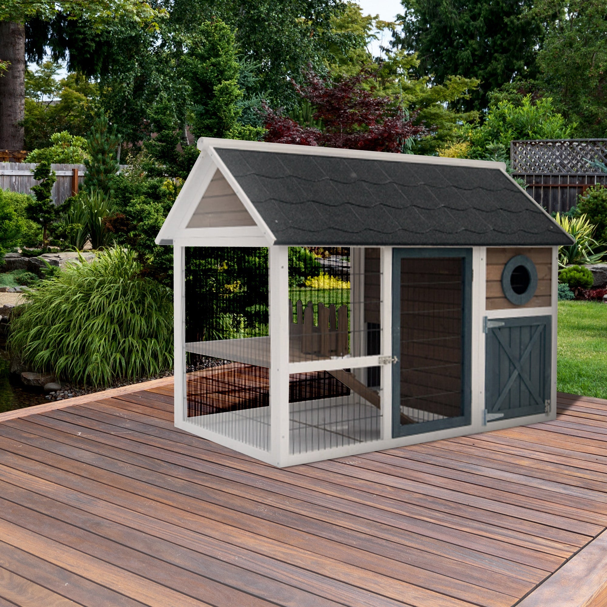 Crafted with care and durability in mind, this large rabbit home offers ample space for your bunnies to roam and play while ensuring they stay protected from the elements. Constructed from solid wood and featuring an asphalt roof with decorative tiles, our hutch not only provides a fashionable touch to your outdoor space but also serves as a sturdy shelter against the sun, wind, and rain. Say goodbye to worries about your pets' comfort as the angled roof design ensures they stay warm, dry, and happy year-round. Cleaning up after your rabbits has never been easier thanks to the convenient metal pull-out tray located in the enclosed area. With easy access from outside the hutch, maintaining a clean and hygienic environment for your pets is a breeze.