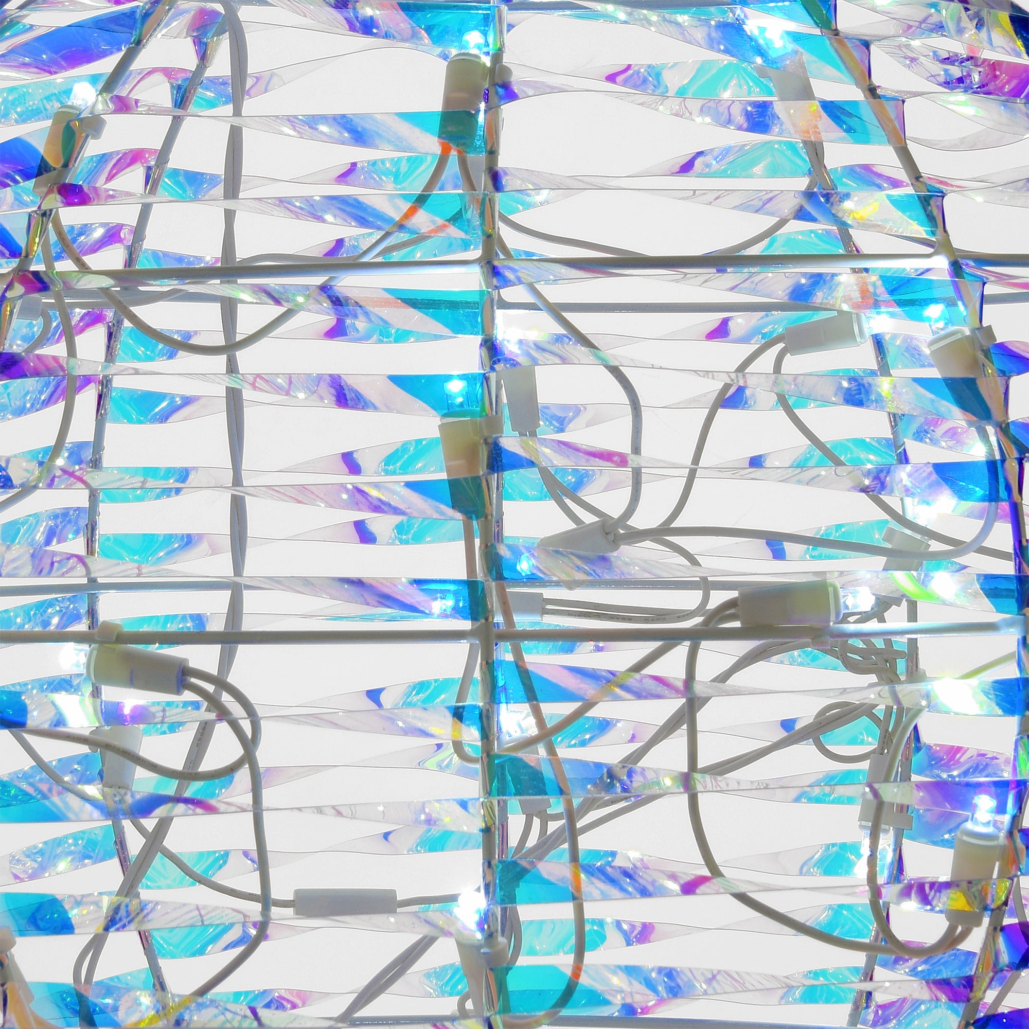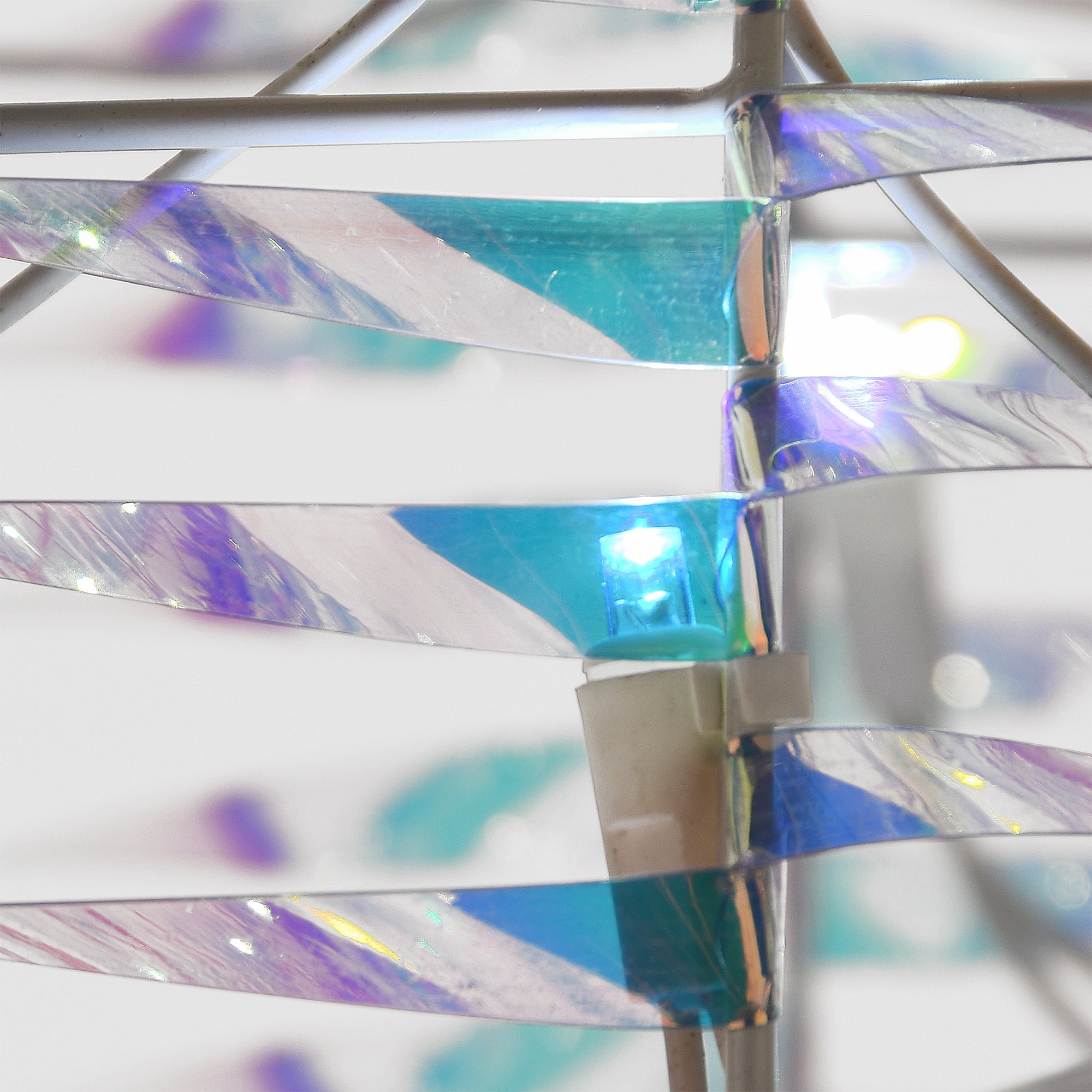 - Iridescent Mylar material reflects different colors when hit by the light, with blue, silver, and purple colors most prominent