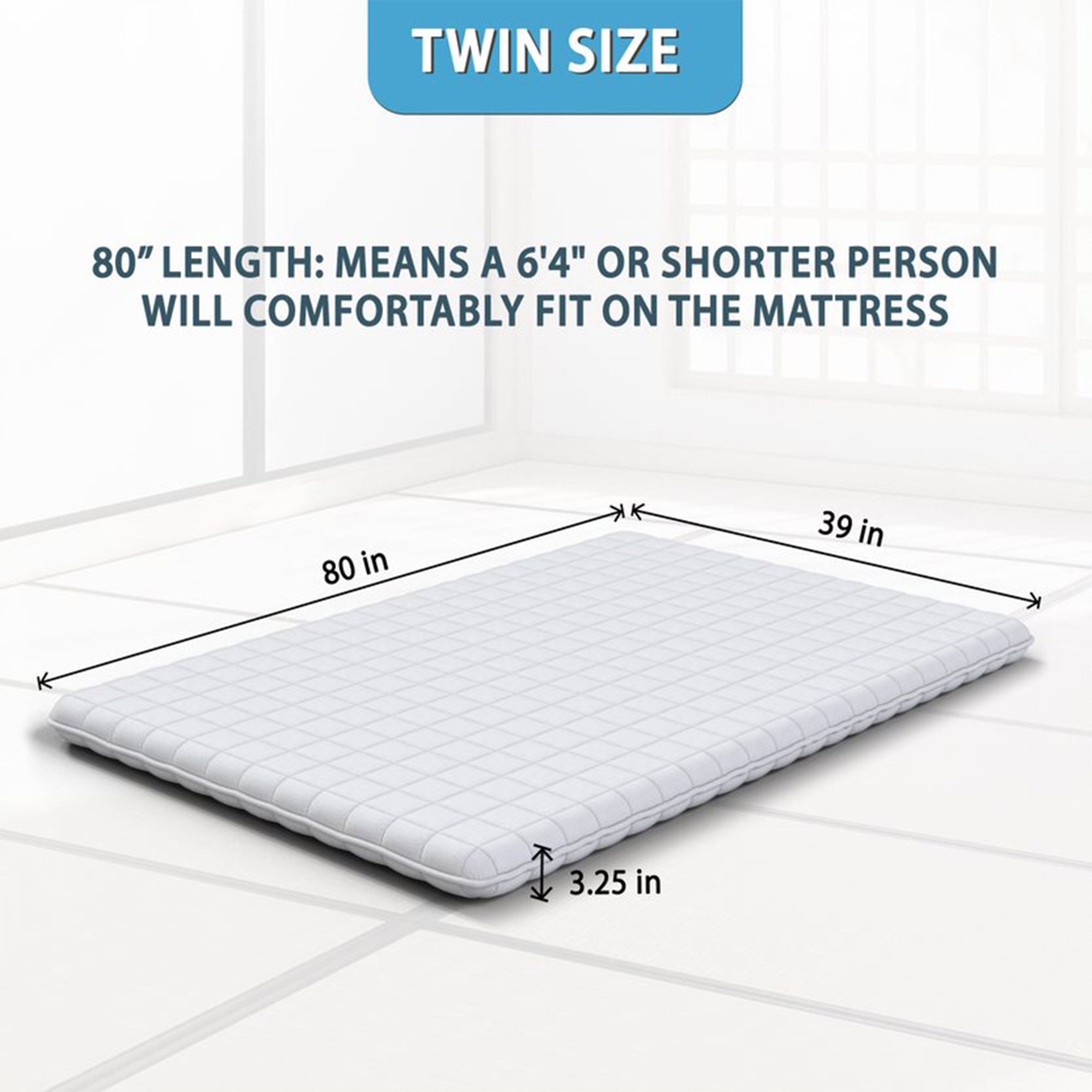 Designed for the optimal balance between comfort and support, this futon mattress delivers sufficient cushioning around pressure points and maintains your spinal alignment using the floor for solid support. This medium-firm floor bed provides a minimalist approach to decorating any bedroom yet boasts adequate sleeping space with its twin mattress measuring 80 inches by 39 inches. Appropriately sized at 3.25 inches thick, the sleeping mat elevates your body perfectly off the ground for a deeply comfortable rest.