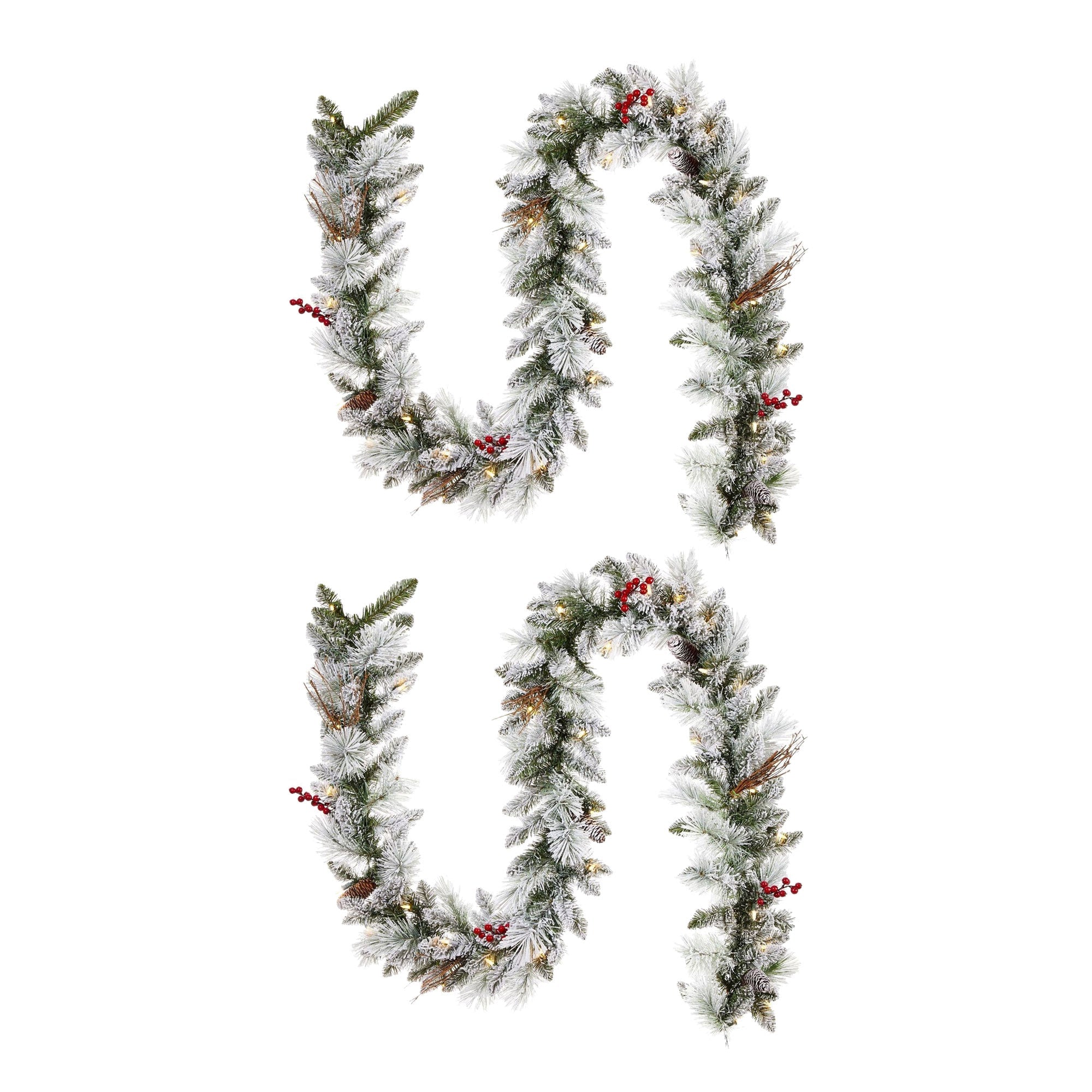 • Enhance the look of your holiday decorations with this set of 2 realistic and pre-lit Christmas garland strands that recreate the enchantment of a snow-covered forest with its lifelike design and intricately placed snow-dusted berries