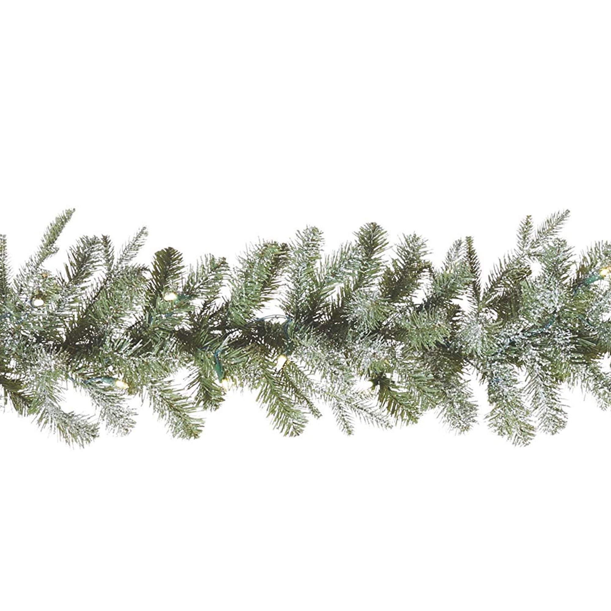 Matching the wreath with realistic foliage and bright lights, the frosted holiday garland brightens the room and brings in the holiday cheer. Place this Christmas holiday decoration inside or outside your home, year after year. Each strand of artificial garland measures 9 feet long. With 290 PE and PVC glitter-flocked frosted fir needles of various greens and varying depths, this holiday garland features a charmingly realistic look. This pre-lit Christmas garland also features 35 bright warm white LED lights that give the holiday decoration a cheerful glow. The holiday garland with warm white lights is battery-powered for convenience, so there's no power cord to worry about. With its easy-to-use battery-operated design, this artificial Christmas garland is easy to hang and display indoors and outdoors.