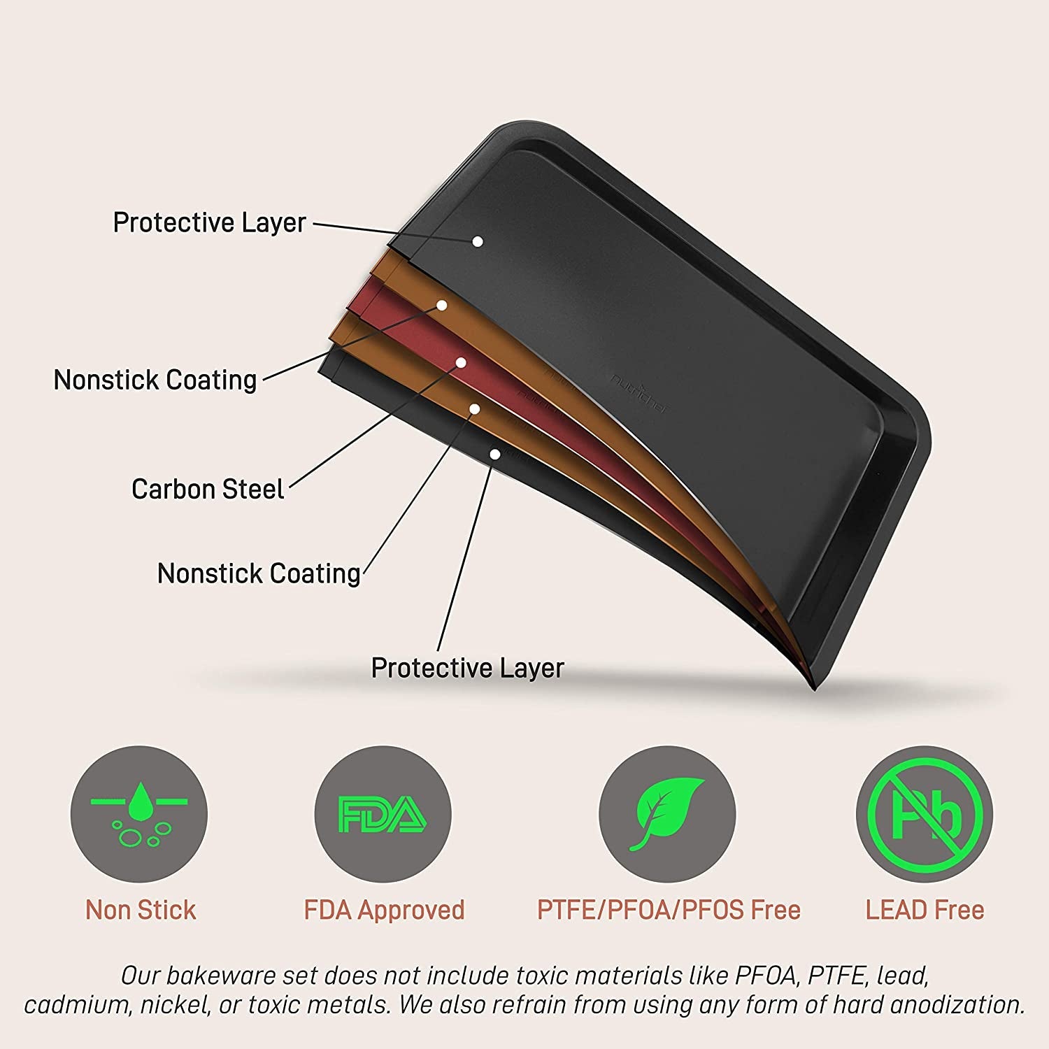 - Wide pan design makes it easy to stack and store the 10-piece bakeware set