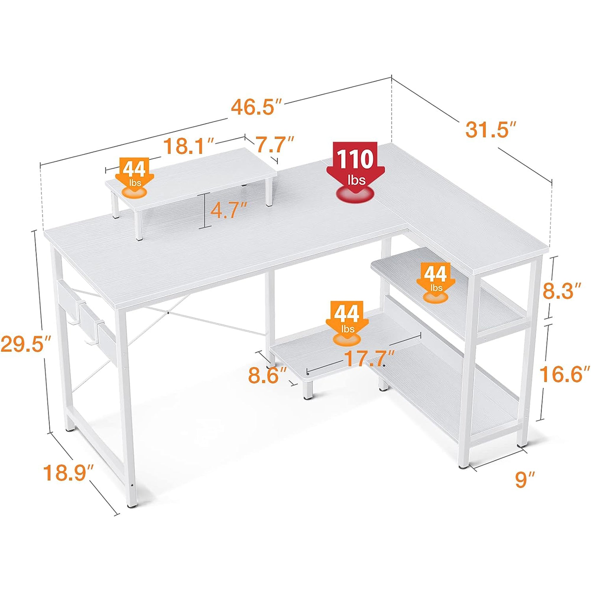 ODK 47 Inch Compact L Shaped Desk with Storage Shelves and Monitor Stand, White