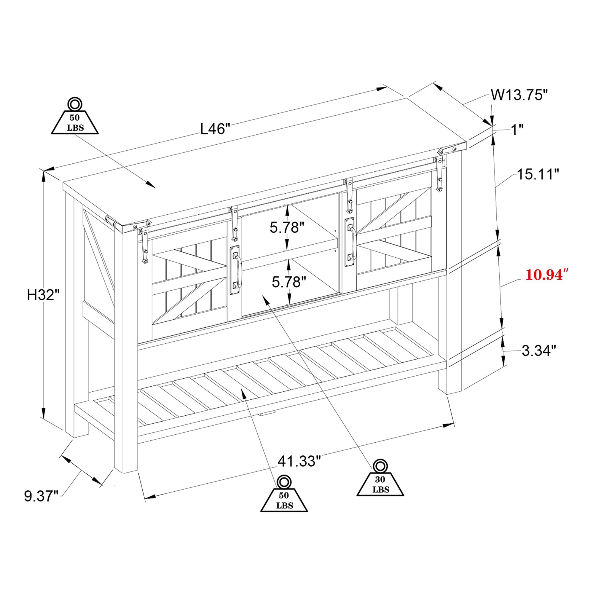The sliding barn doors cleverly conceal two deep-set shelves, setting this console table apart and offering a discreet storage solution for linens, blankets, board games, DVDs, and other everyday items. Even when accommodating heavier possessions, the lower shelf remains steadfast, thanks to the central leg support, ensuring durability and functionality. Measuring 46 inches in length, 13.78 inches in width, and 31.97 inches in height, this table provides ample space for storage and decoration, making it a versatile and stylish addition to your home. Elevate your living space effortlessly and express your unique style with the OKD Farmhouse Console Entryway Table – an embodiment of classic elegance with a modern twist.