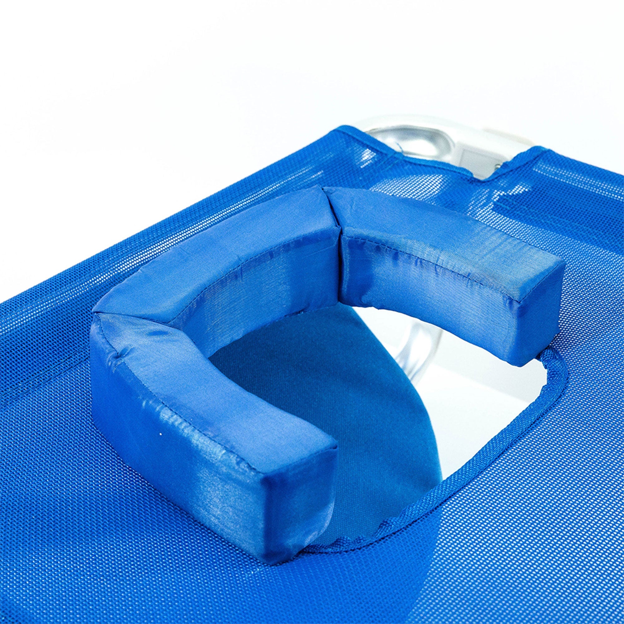 With the patented open/close face cavity, this outdoor folding chair allows you to lie on your back with cushioning from the pillow, or lay on your stomach with the handy open face cavity to support your neck and head. The seat height is 6.5 inches off the ground, perfect for poolside hangouts or laying out at the beach. Using the 5-position adjustability, you can choose to sit up, recline, or lay flat to soak up the sun, sit on your patio, or watch the game with friends. Thanks to the sturdy aluminum frame, the outdoor chair can support up to 250 pounds and resists rust for long-lasting use. The wooden armrests add style and function while the quick-dry breathable mesh fabric ensures you're kept comfortable while out in the heat whether you're out camping, going to sports events, or simply hanging out in your backyard.