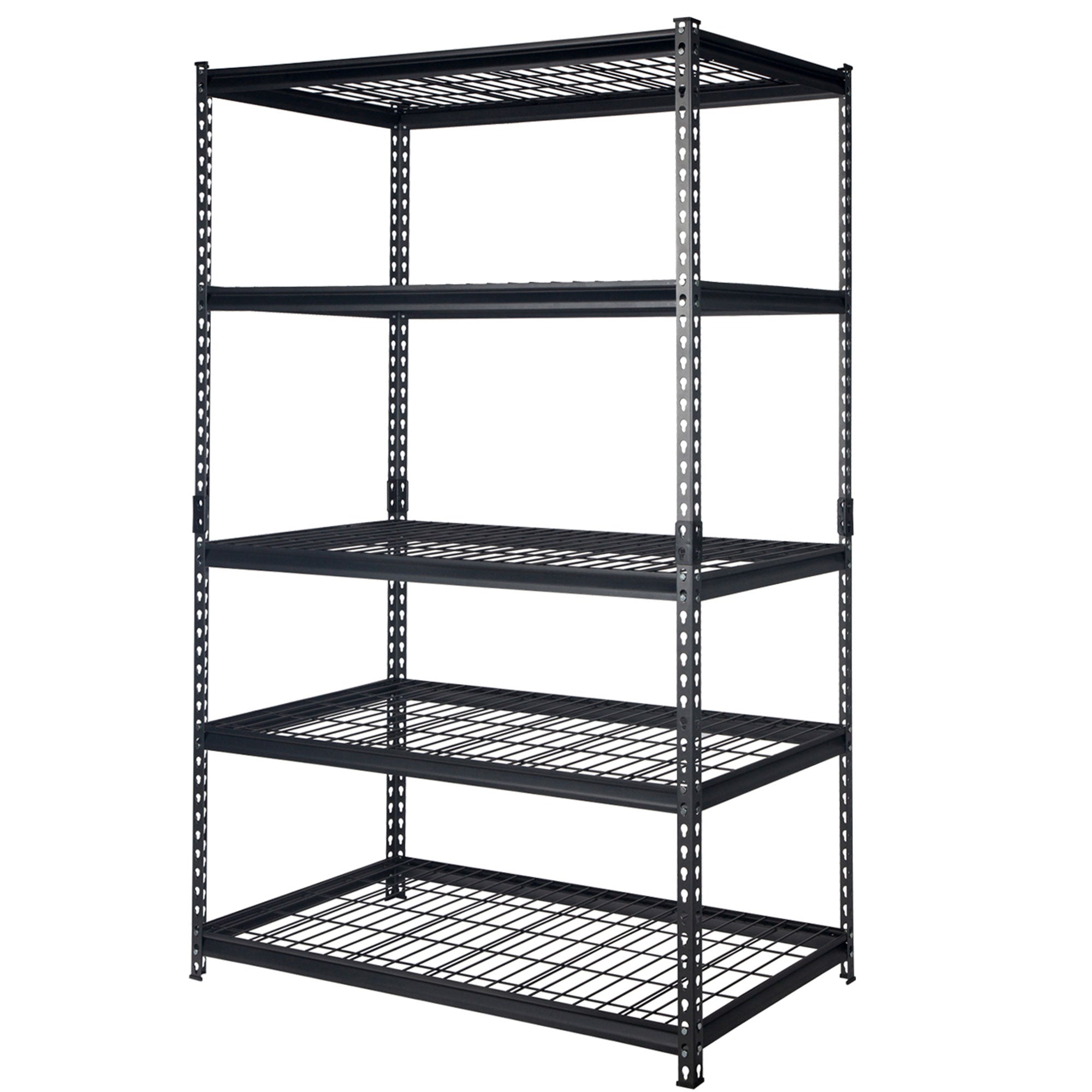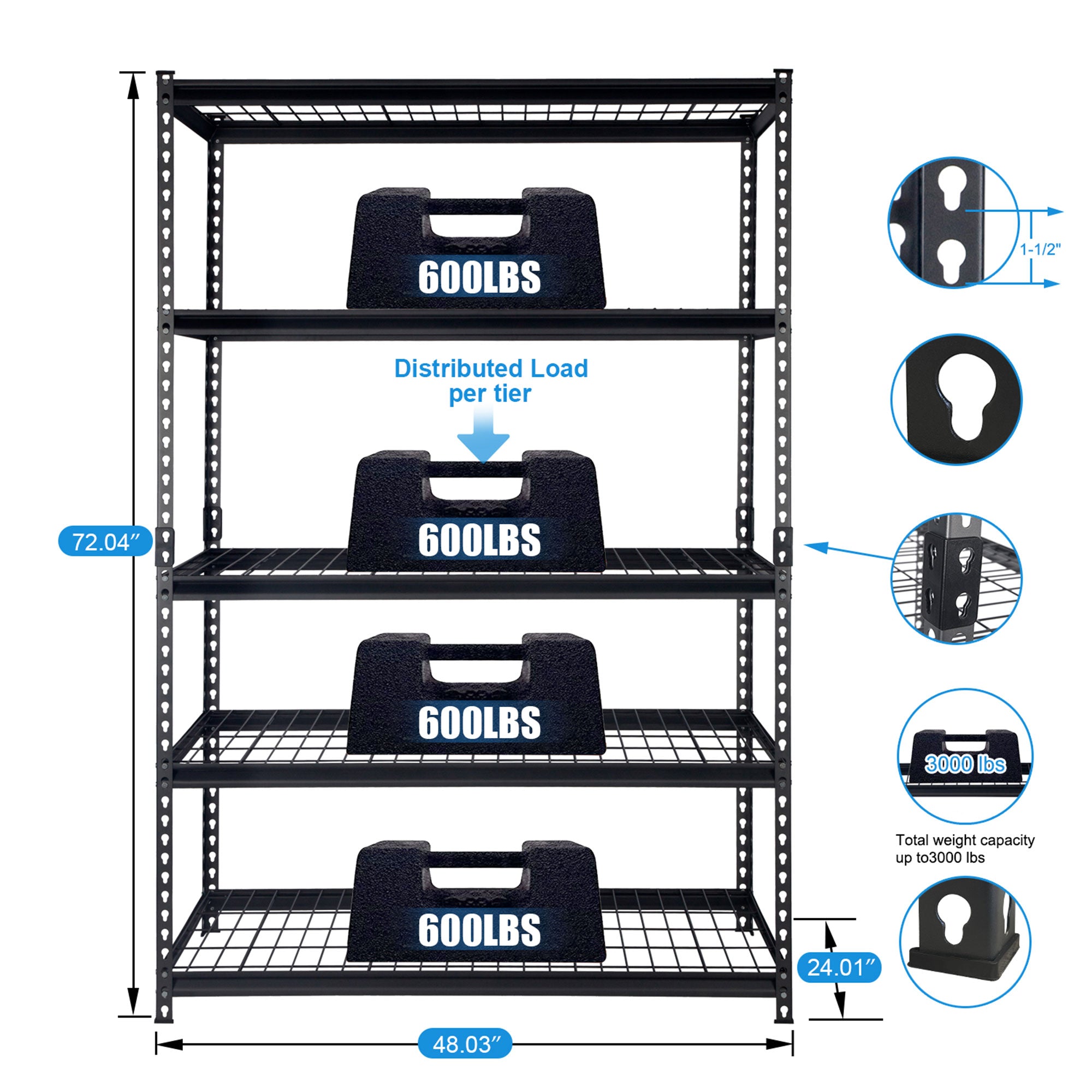 - Supports 600 pounds per shelf when distributed evenly and 3,000 pounds total