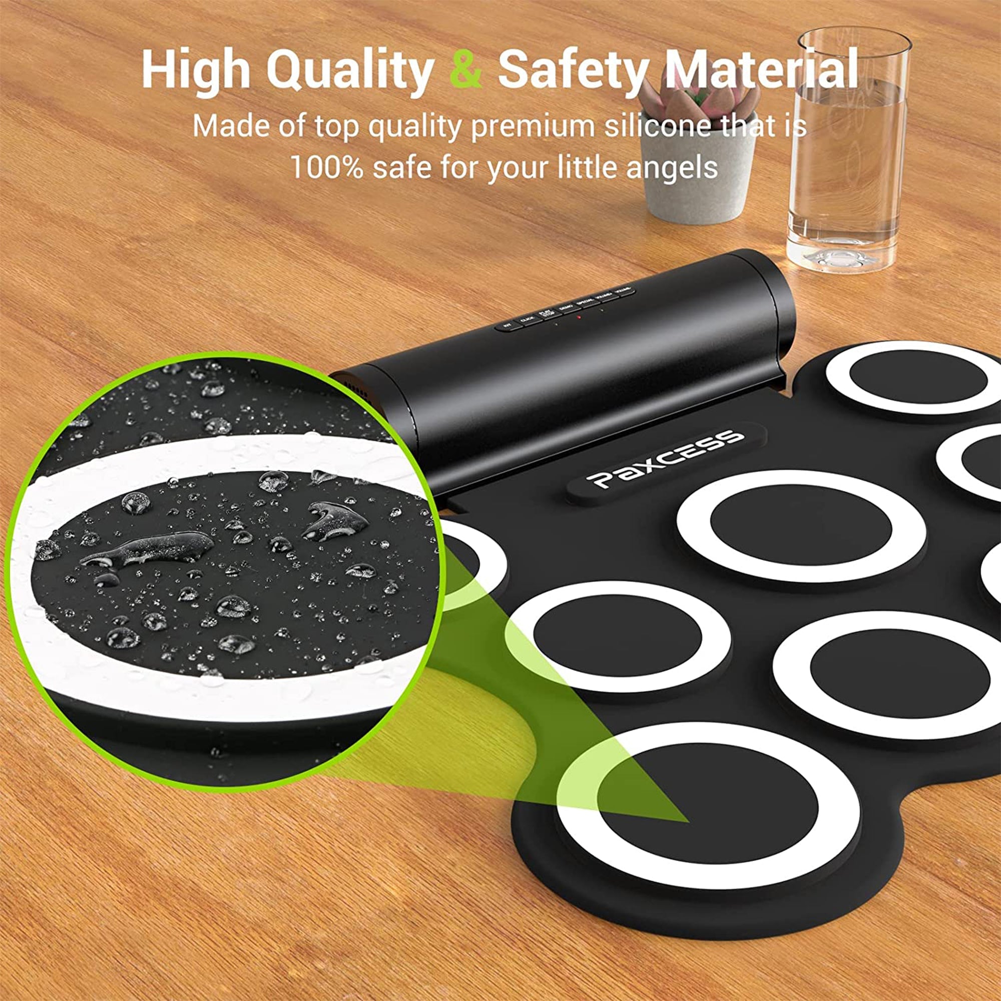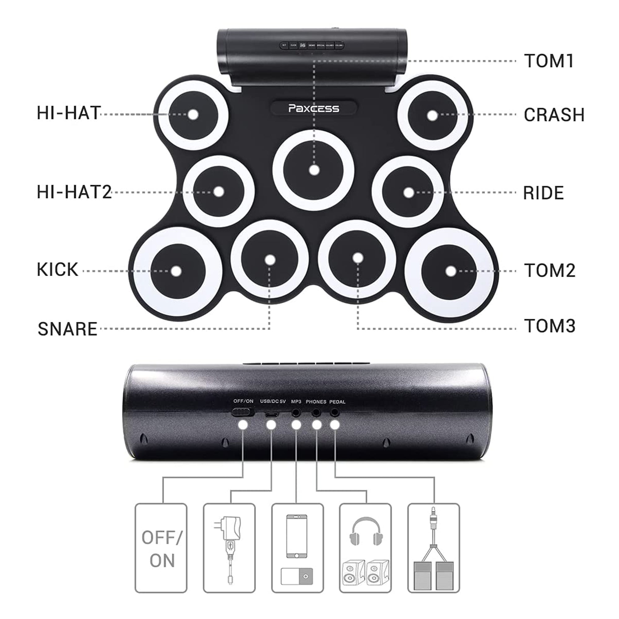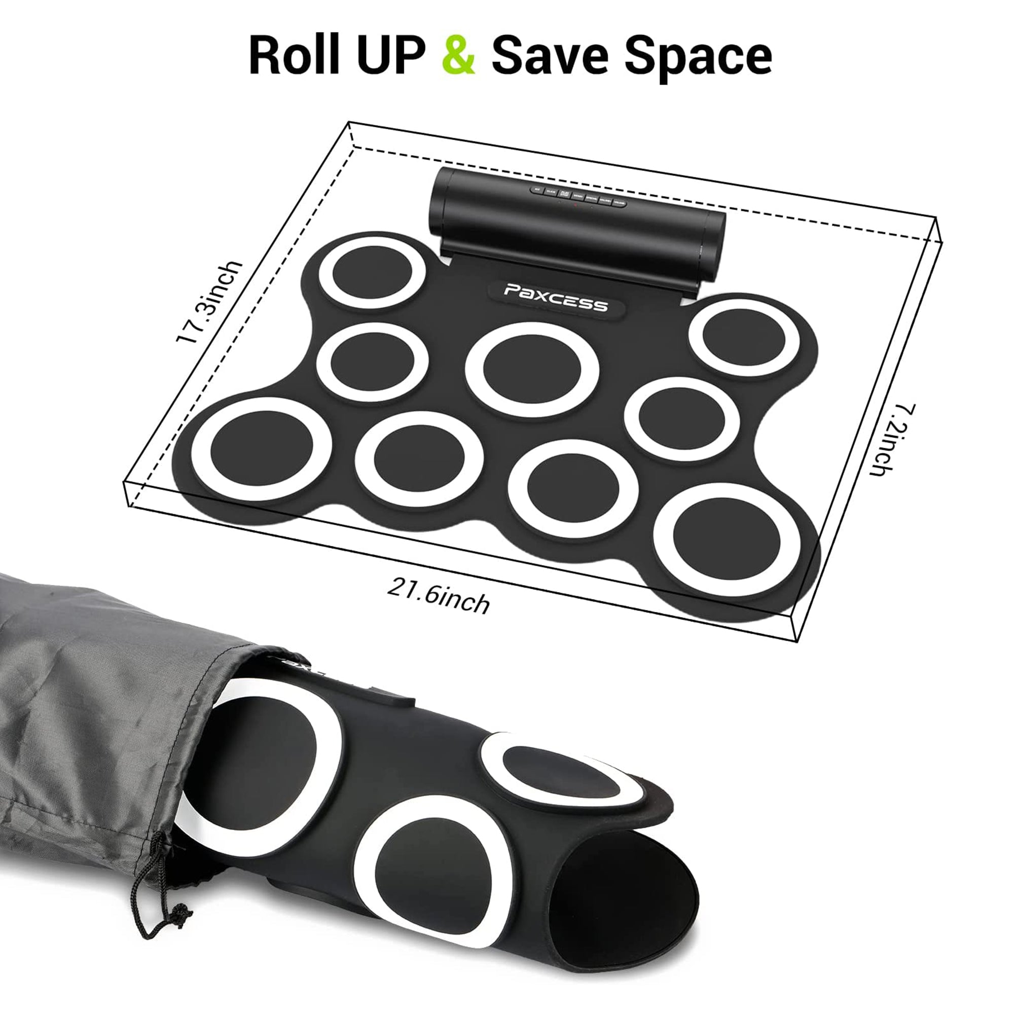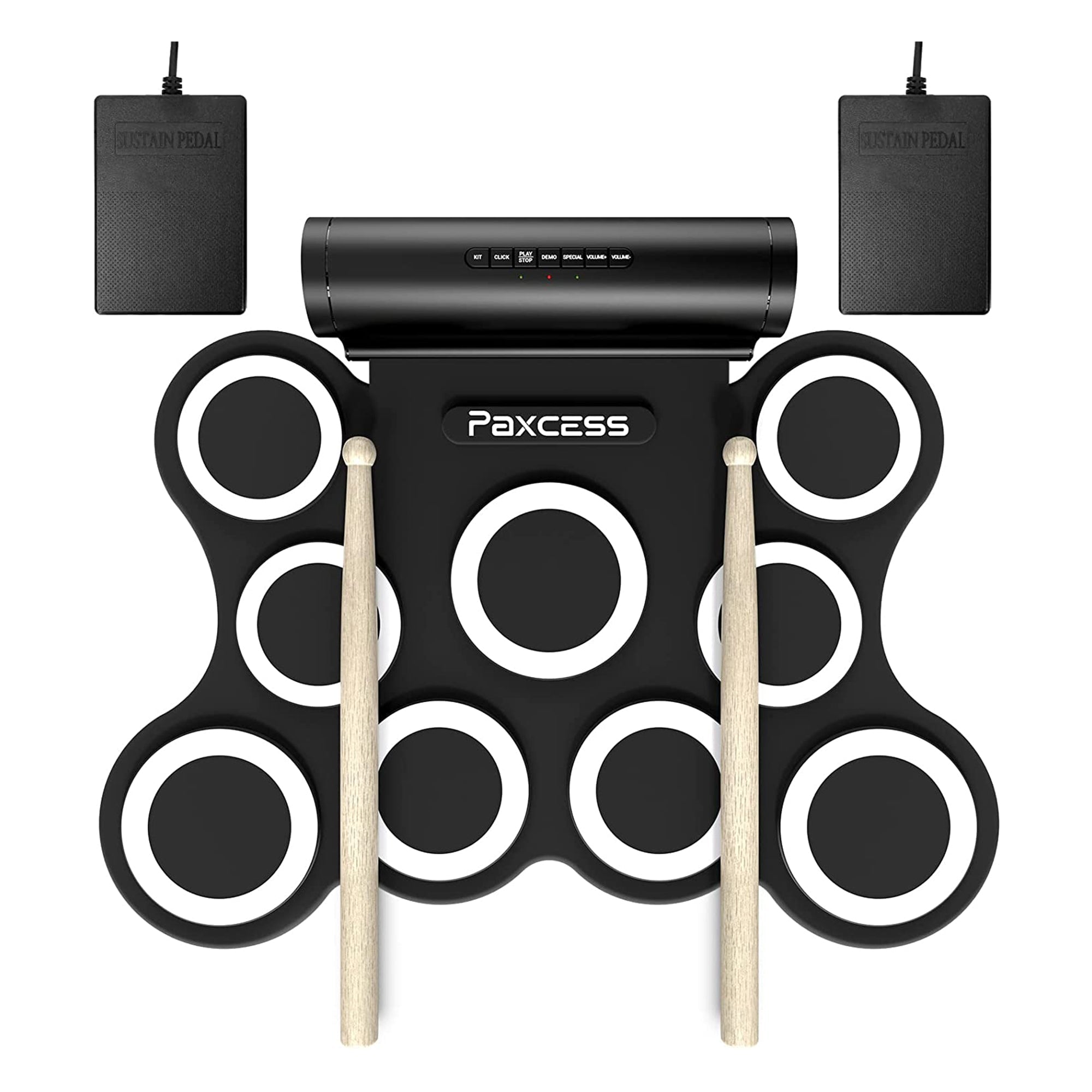 Drum sets can be unwieldy, loud, and hard to transport. Practice anywhere with the portable and convenient 9-Pad Electronic Drum Set by PAXCESS.