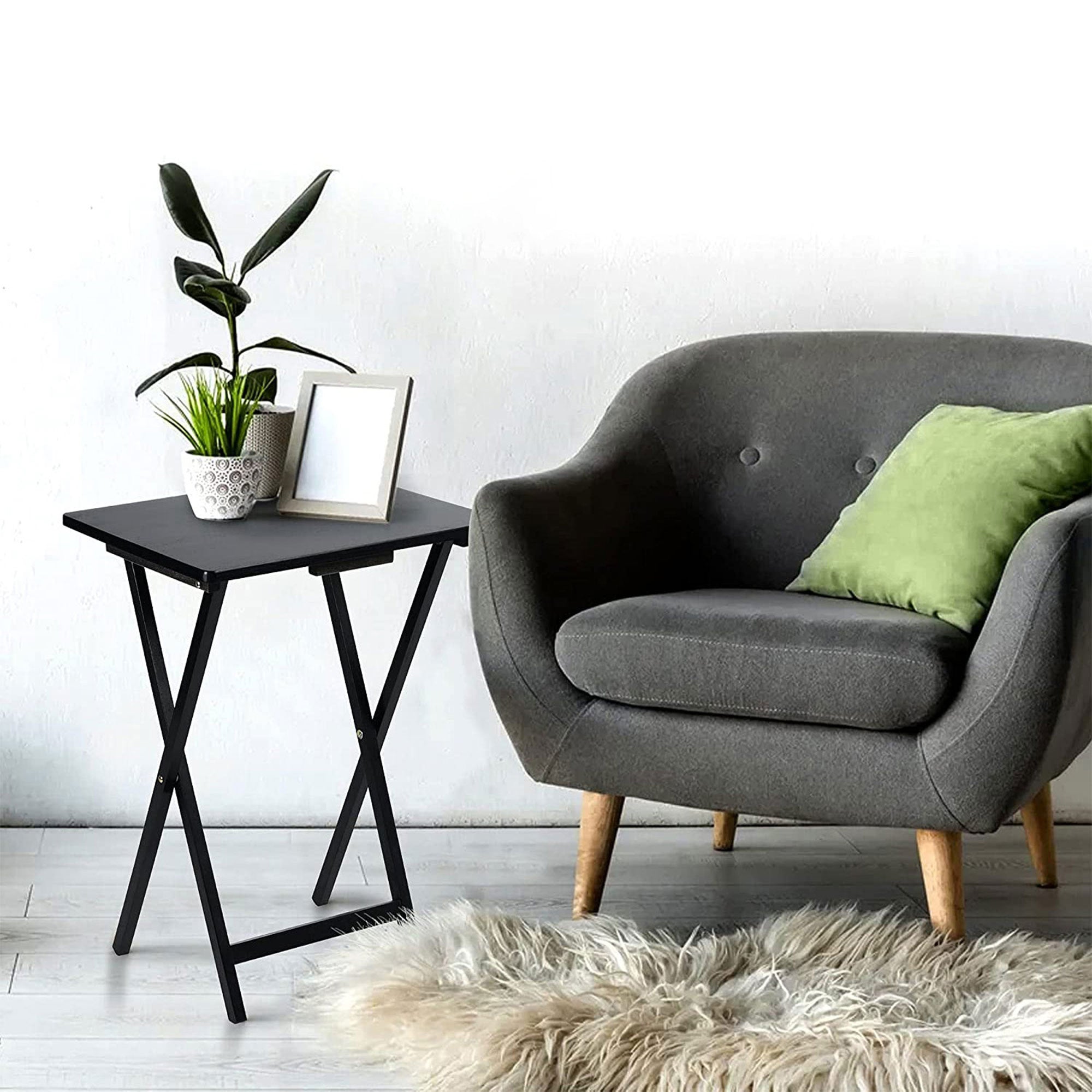 The trays store easily behind a door, in a closet, or even behind the sofa, thanks to the handy storage rack. Collapse each table when finished, and set it into the storage rack in an upright, filed position for easy and compact storage.