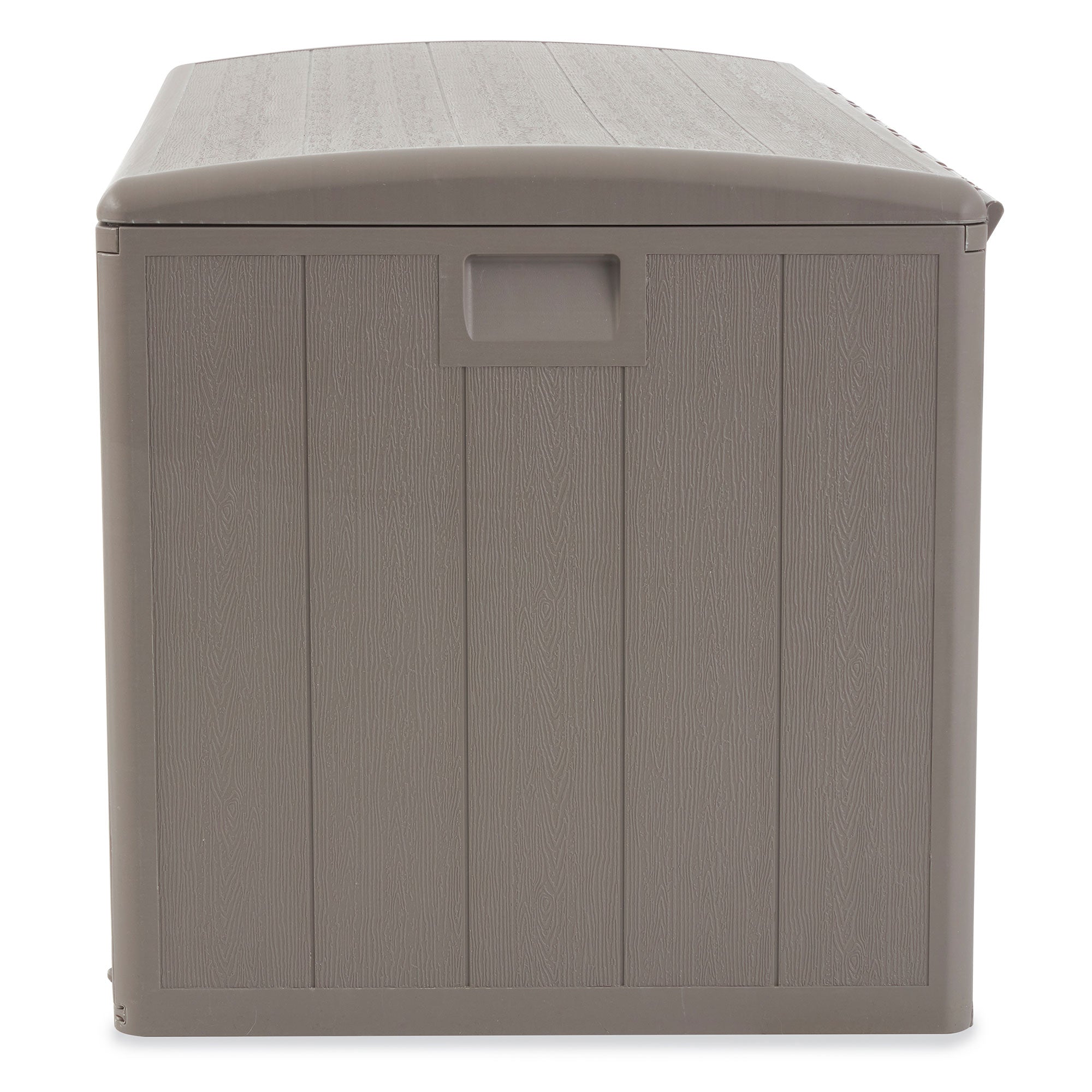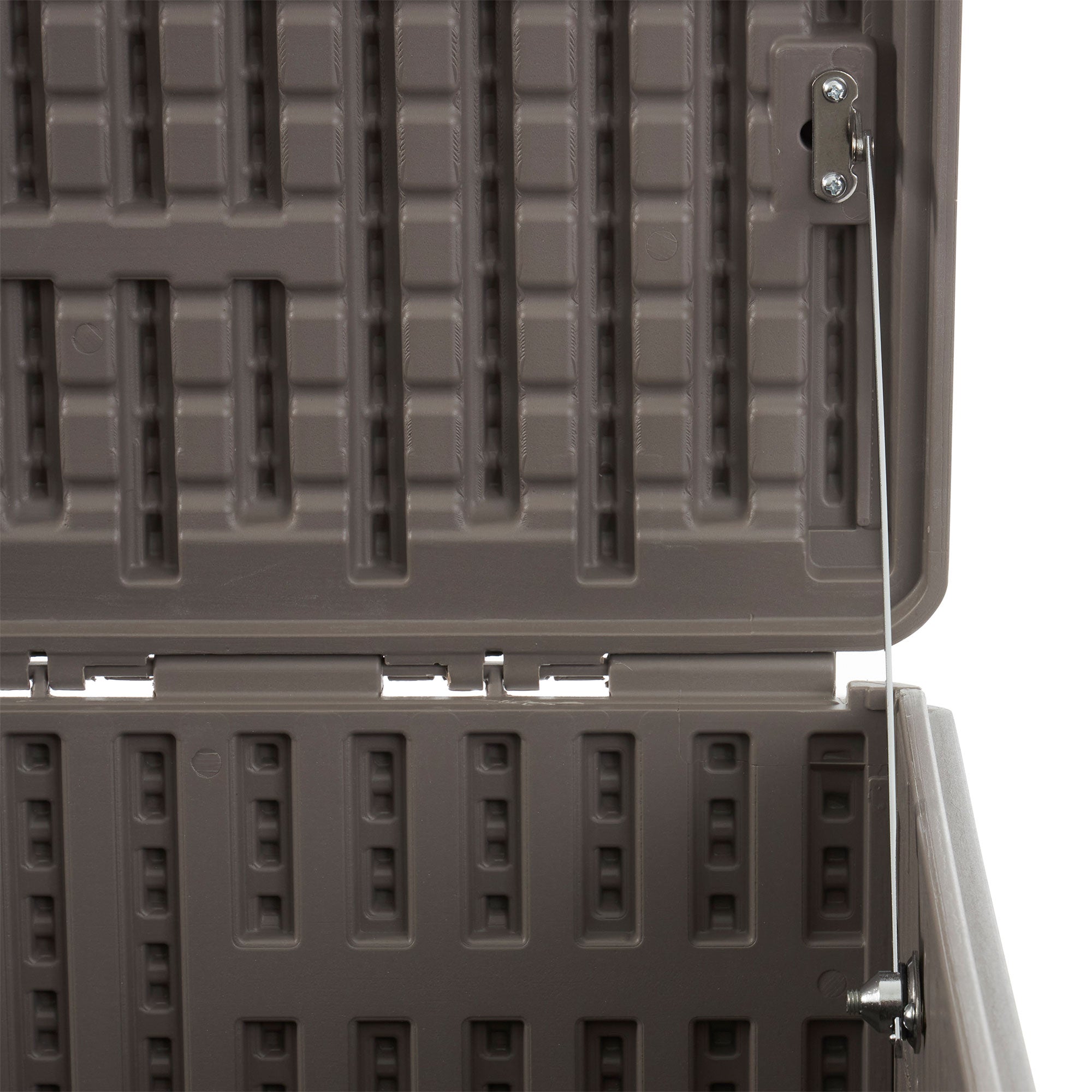 Ideal for your backyard patio, this versatile storage bin can be used to hold cushions, tools, pool toys, and more accessories. With a spacious 130-gallon capacity, the opportunities are endless. Featuring a double-wall resin design, this bin has a molded lid hinge and a soft-close lid that ensure your belongings stay safely secure. The deck box resists weather elements and has a unique, wood-like pattern that will complement any existing outdoor furniture.