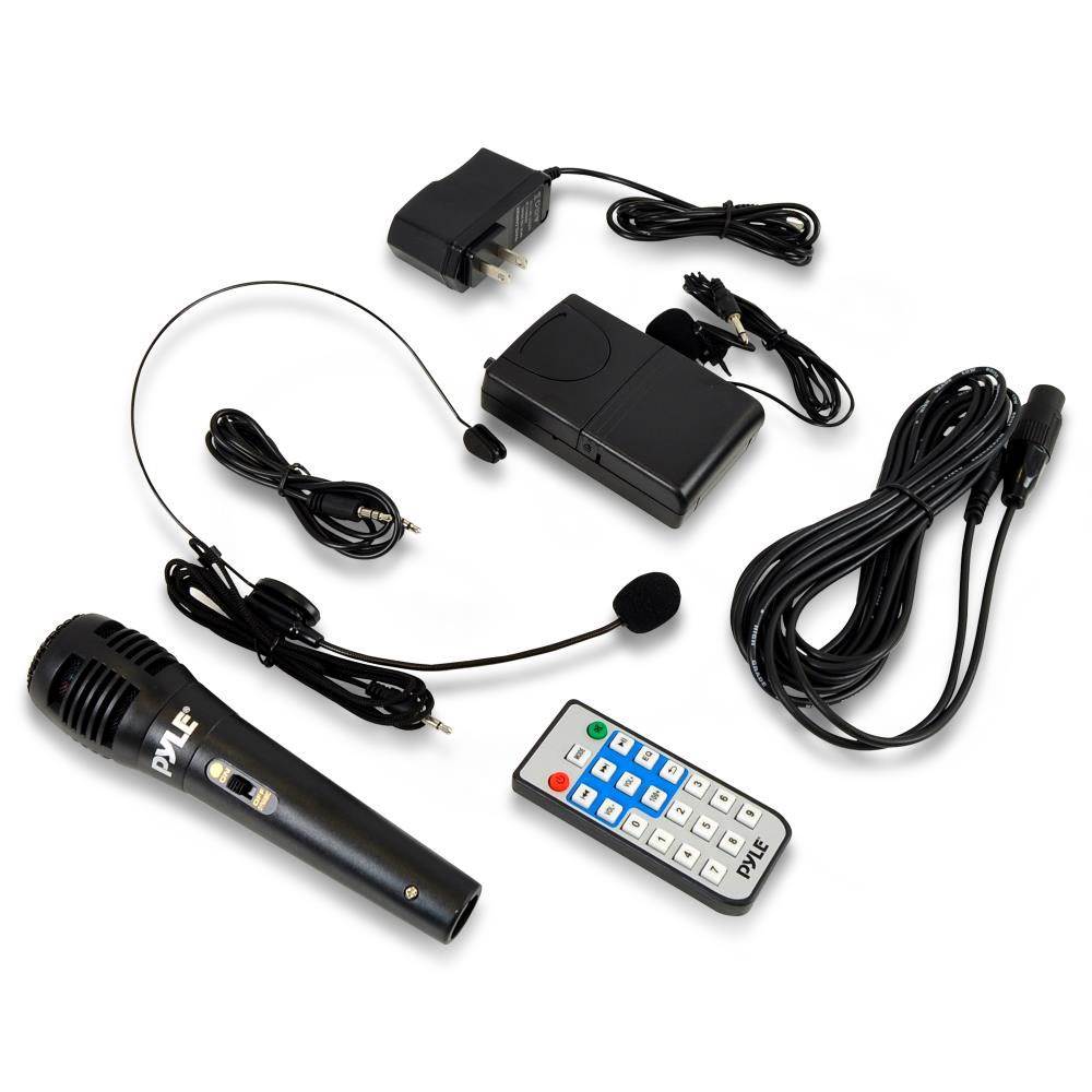 This Pyle karaoke system includes a karaoke speaker, wired handheld microphone, headset microphone, lavalier microphone, audio connection cable, wall power adapter, and remote control.