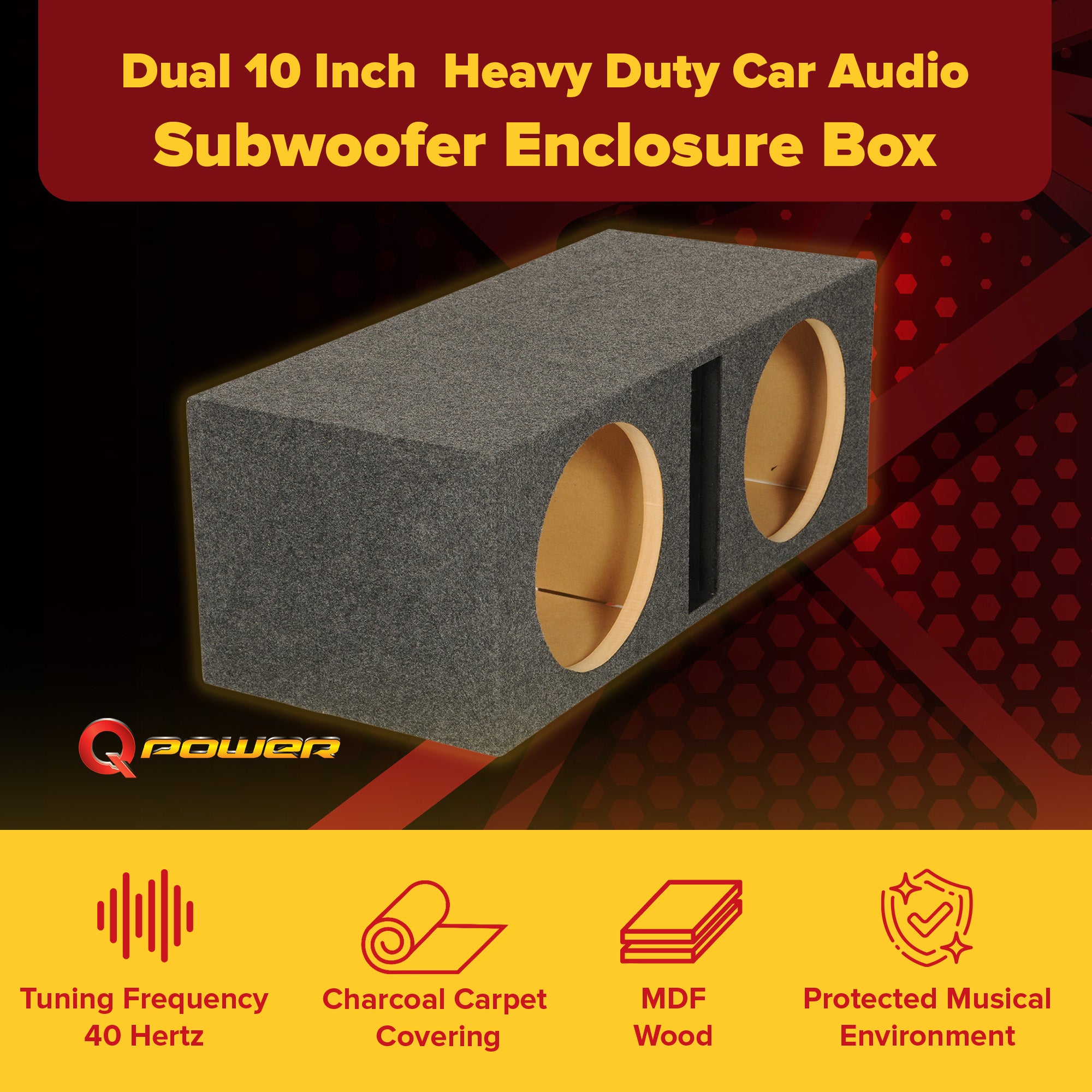 Built to give your vehicle powerful speakers, the QBASS Dual 10-Inch Subwoofer Box by QPower ensures you're the loudest, strongest car on the road.
