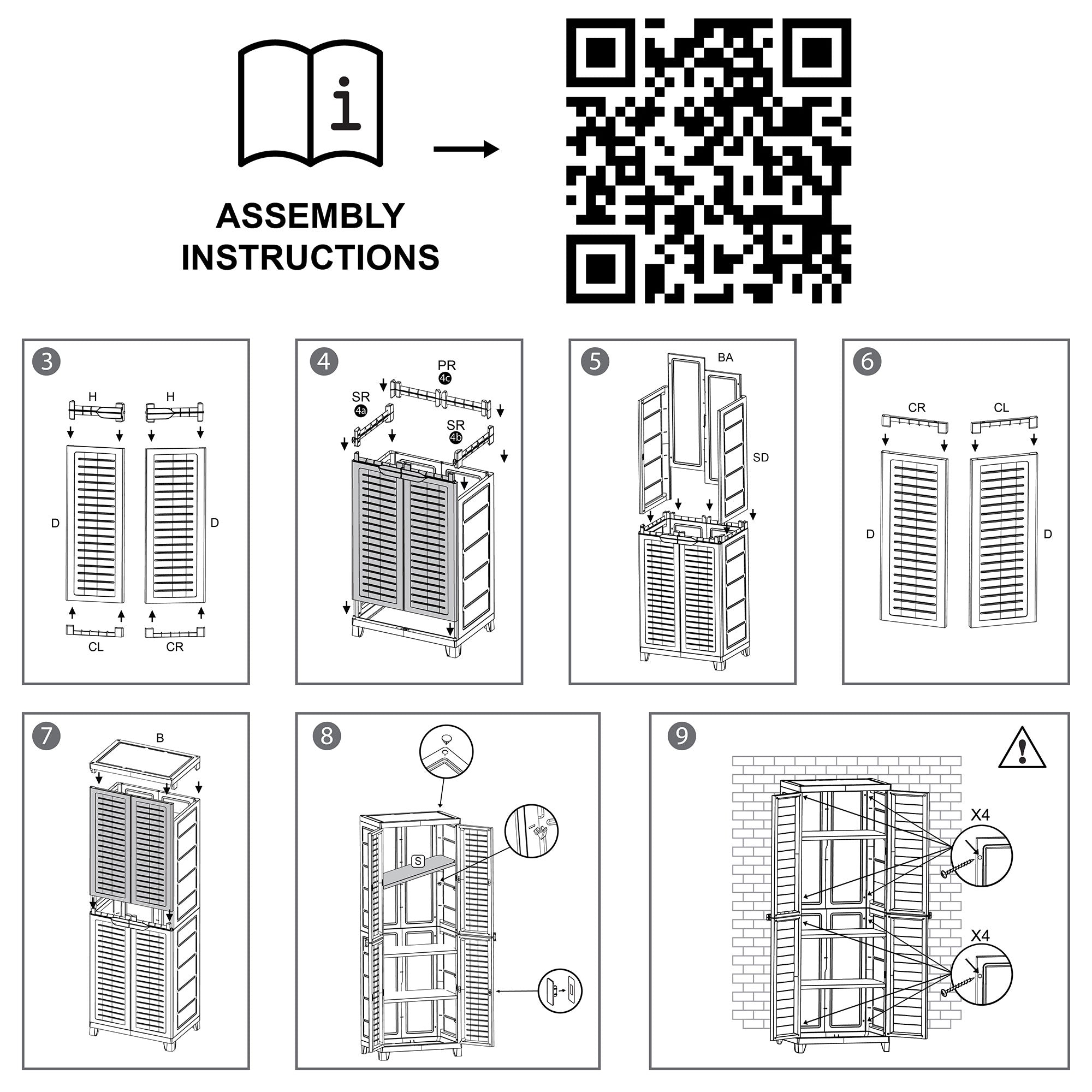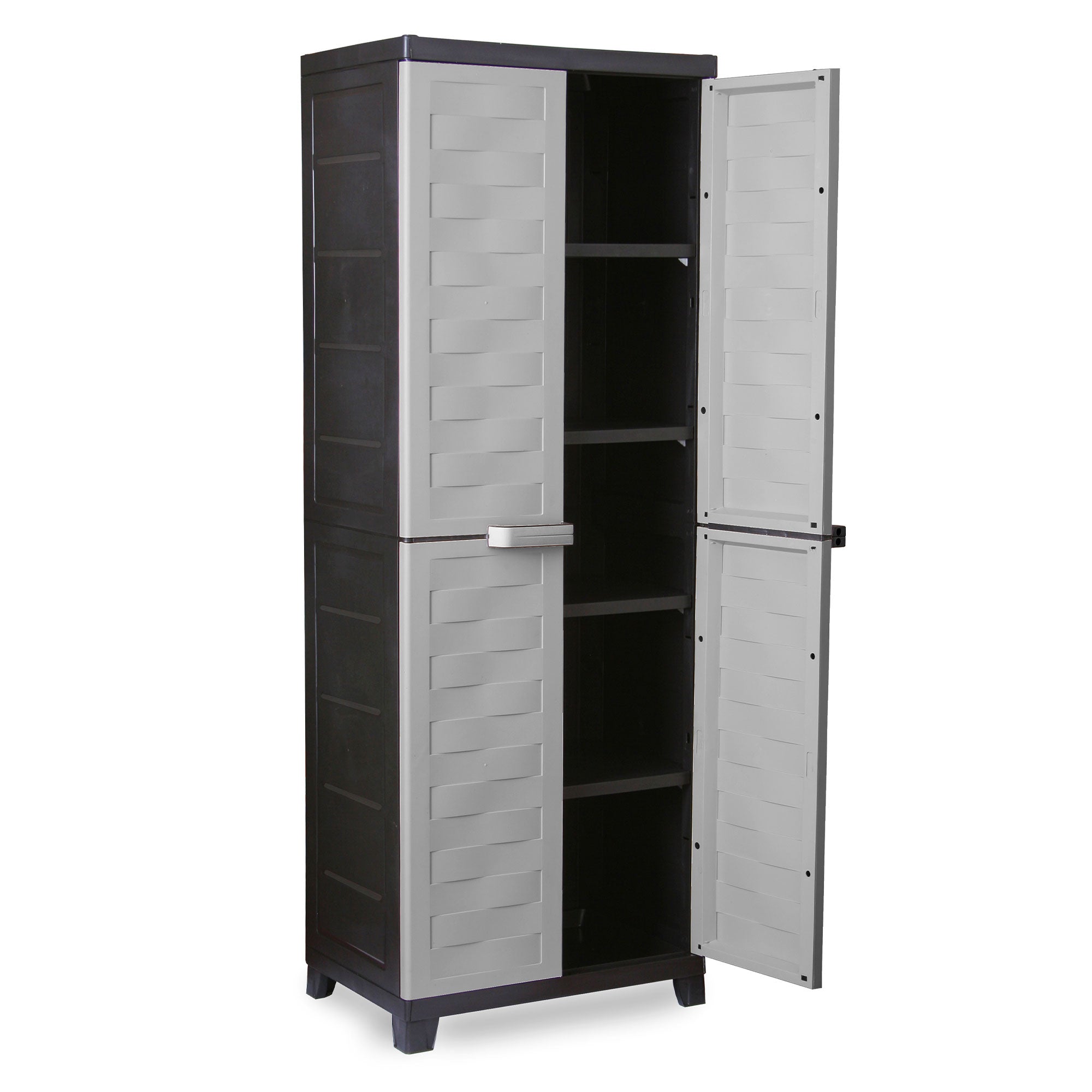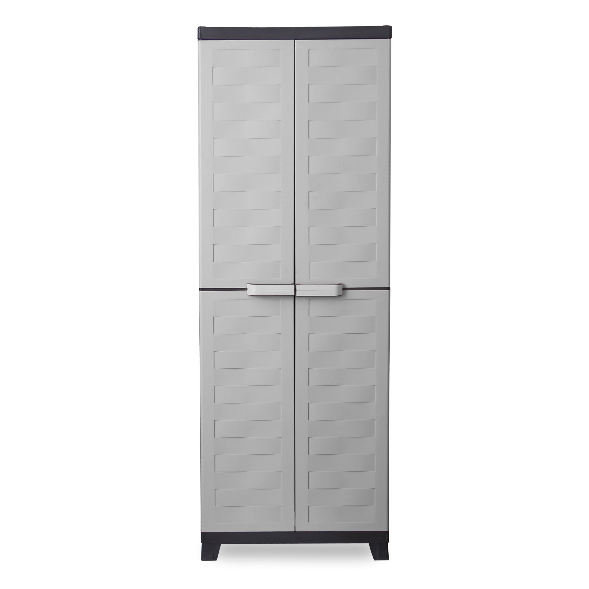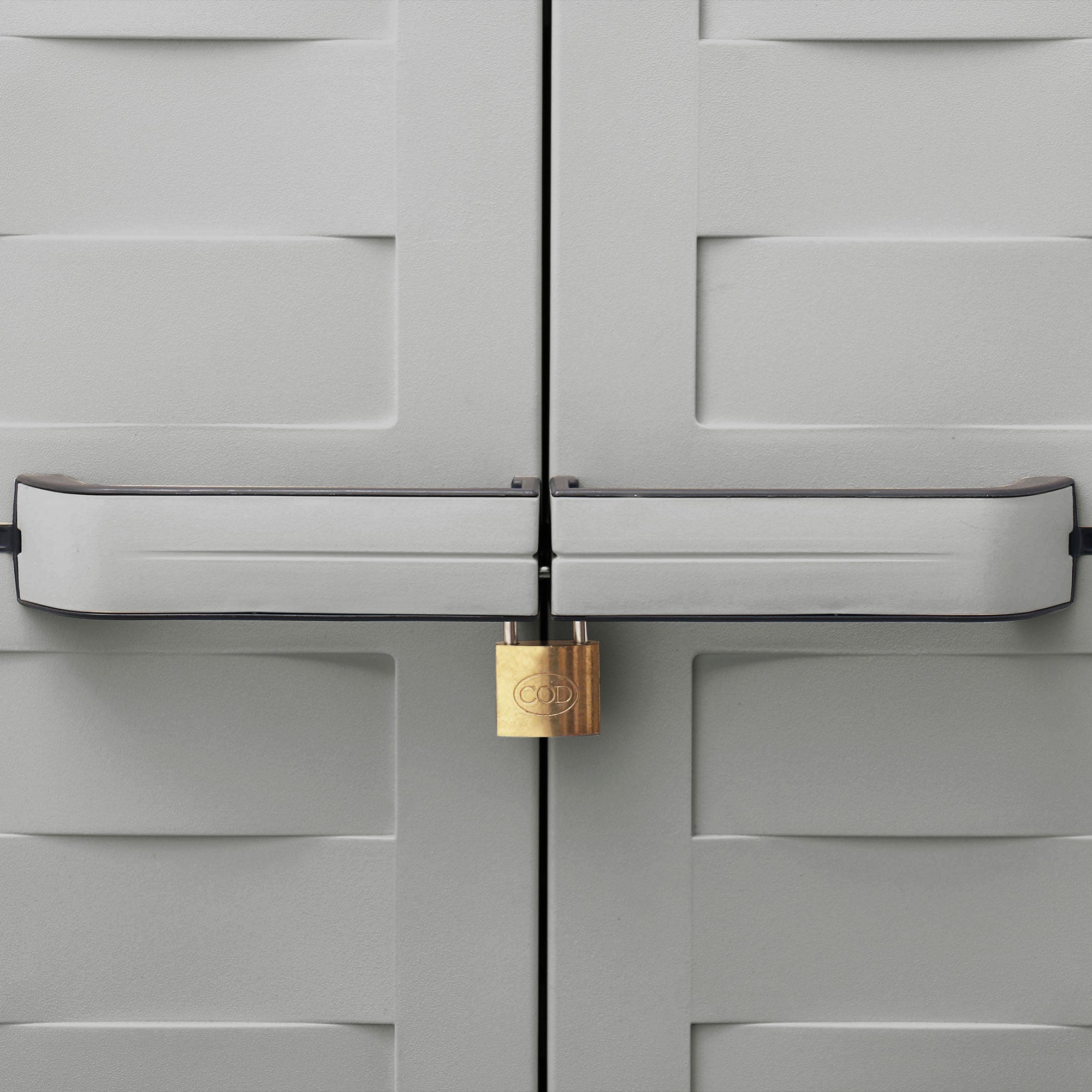 The 4-shelf organizing container provides ample space for items of many sizes. The shelf height can adjust to fit your custom needs and each shelf can support up to 44 pounds. While allowing easy access, this storage unit's doors are lockable in order to keep all of your items secure (lock not included). The organizer cabinet is made from recycled plastic and is heavy-duty for both indoor and outdoor use providing optimal versatility. Additionally, the tool cabinet complements any area well with its simple design and color scheme. Easily assemble the 2-door cabinet as no tools are required and the included legs allow for easy cleaning.
