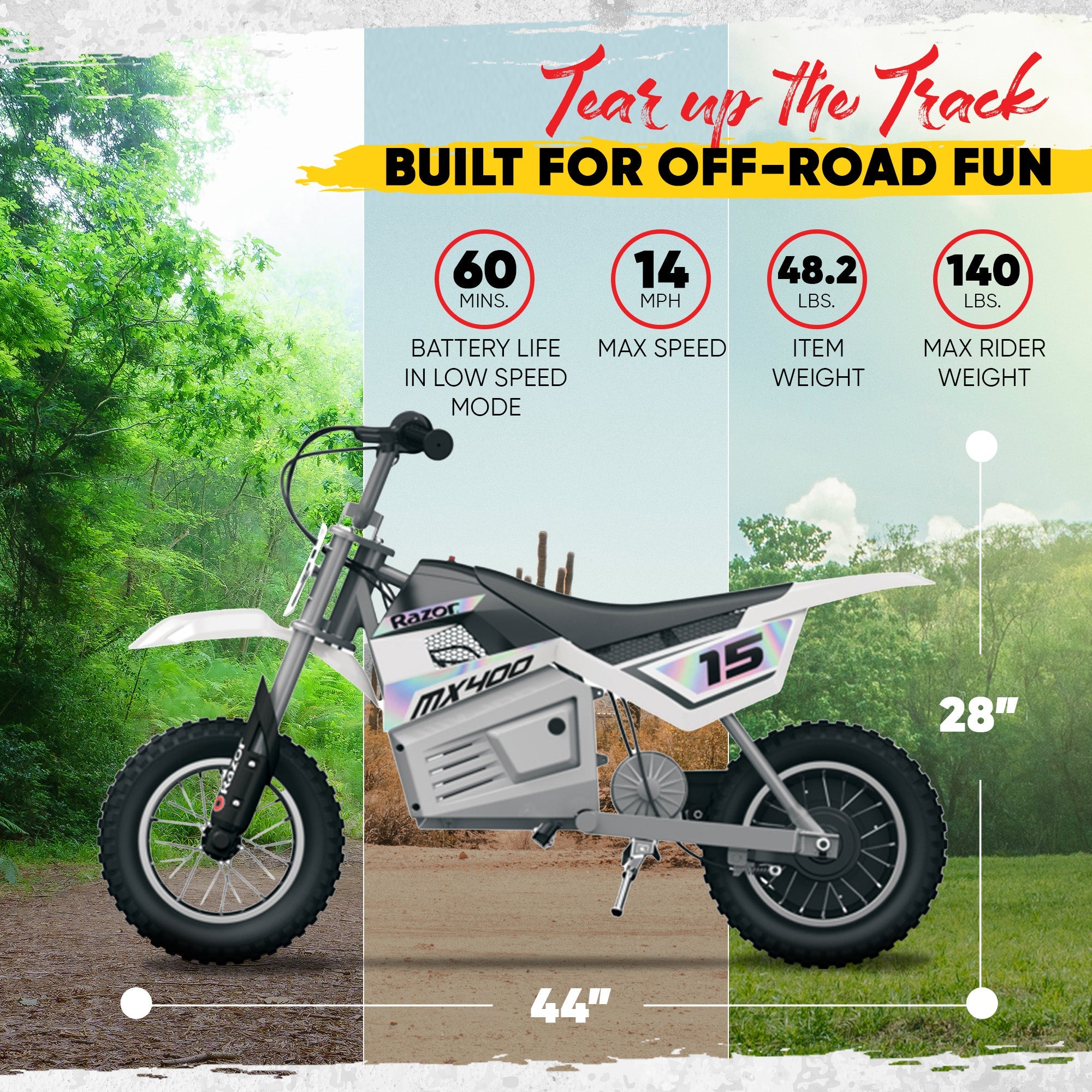 • Large 12-inch pneumatic knobby tires are designed for the dirt delivering maximum power transfer