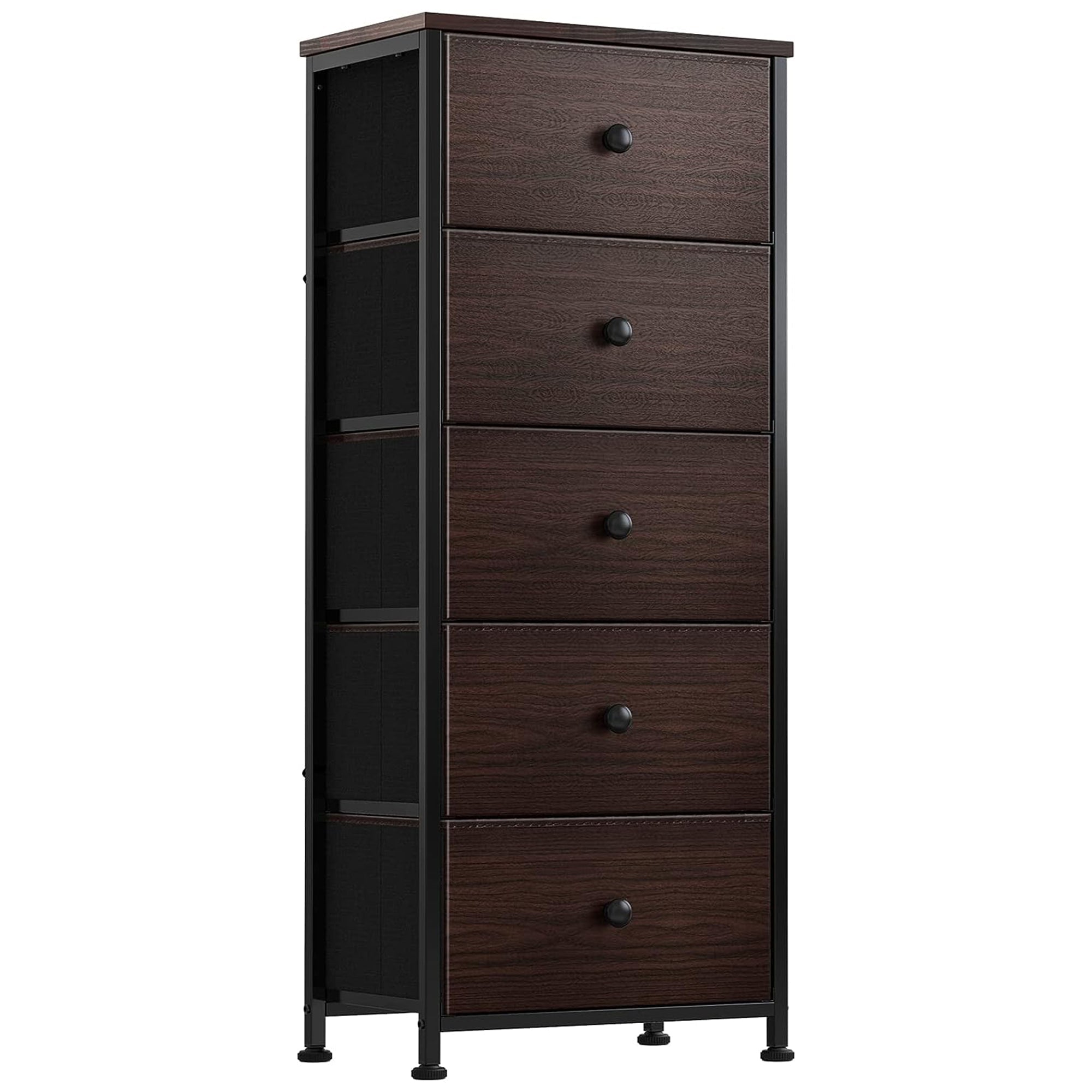 REAHOME Vertical Narrow Metal Tower Dresser w/5 Fabric Drawer Bins, Rustic Brown