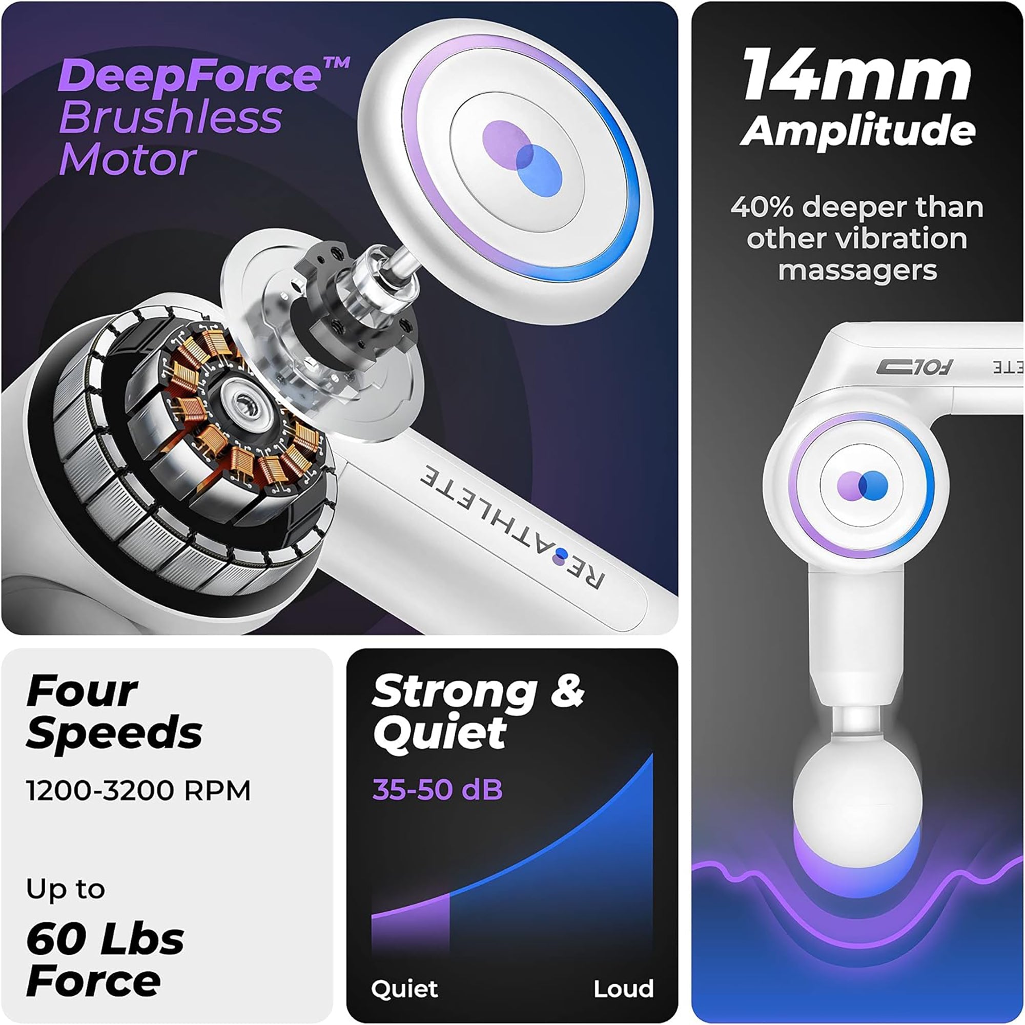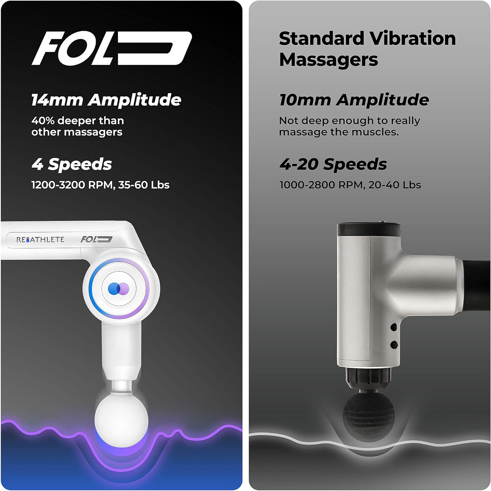 Using the FOLD not only massages your muscles but also increases blood flow, warms up muscles prior to physical activity, and increases overall range of motion. Don't let body pain slow you down by using the Reathlete FOLD Interchangeable Folding Massage Therapy Gun for Athletes.