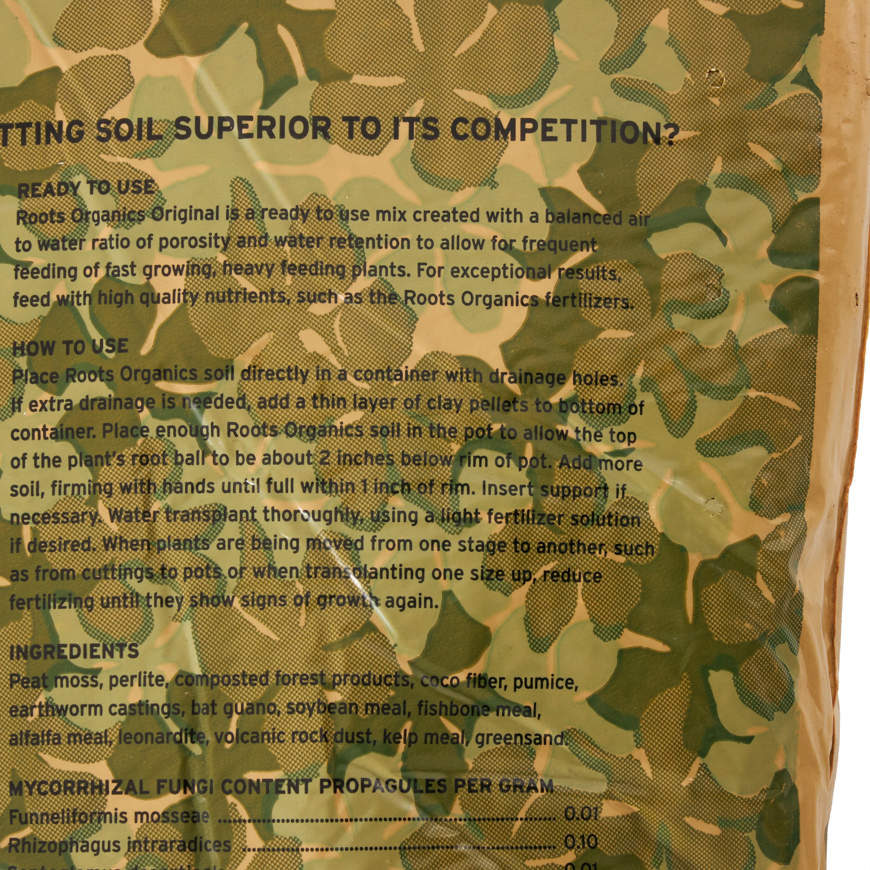 The Roots Organics Potting Soil is already blended with correct proportions of perlite and pumice for excellent drainage and a vigorous root system, Roots Organics potting soil encourages healthier plants and better yields. Comes in a heavy-duty, ready-to-grow, 0.75 cu ft camouflage print bag; simply poke holes in the bottom, cut off the top, and plant.
