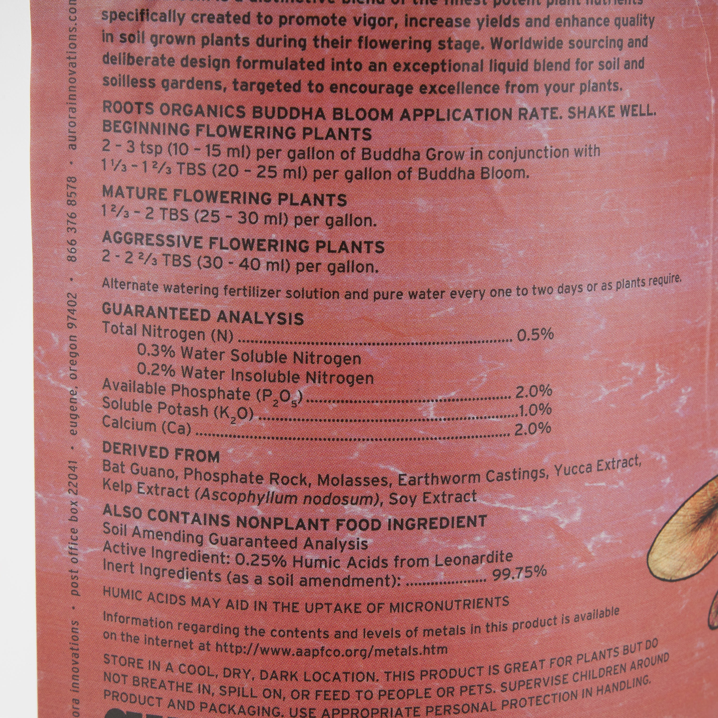 - Roots Organics Buddha Bloom Fertilizer features a proprietary blend of natural, organic ingredients