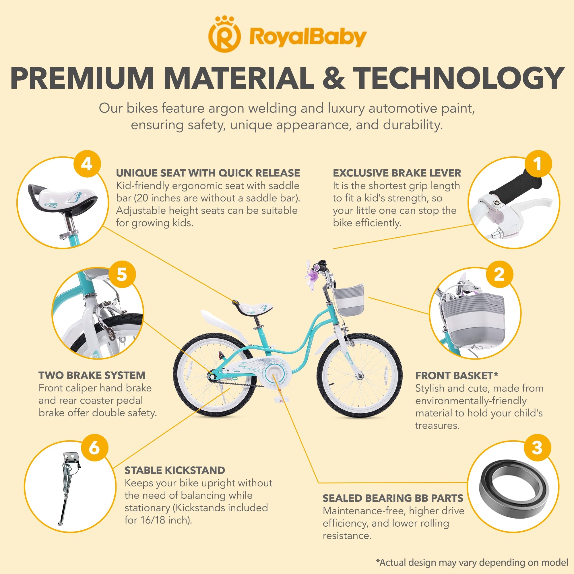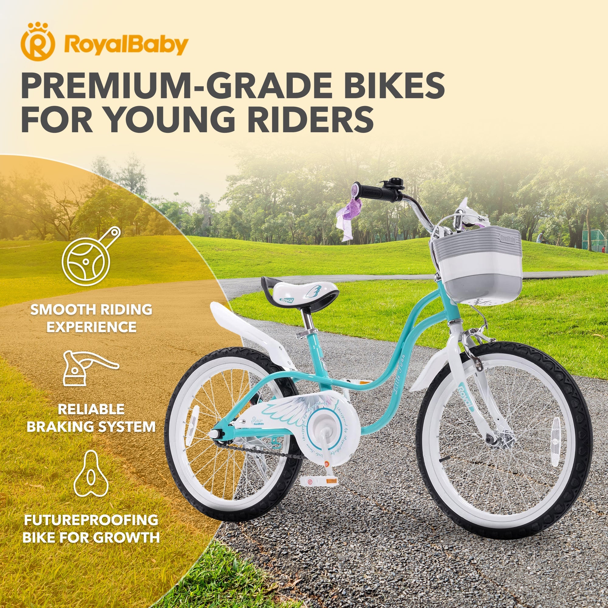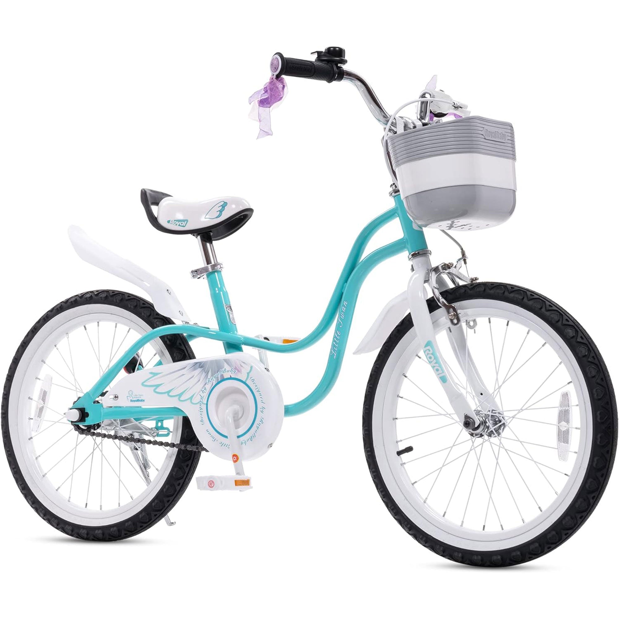 Safety is paramount with the RoyalBaby Princess Bike featuring a robust frame and enclosed chain guard to protect little fingers while the reflectors and bell ensure visibility during riding. Non-slip pedals and durable tires offer excellent grip and control, allowing your child to navigate various terrains with ease. The Princess Bike includes a charming basket, perfect for carrying toys, snacks, or treasures found on adventures to encourage imaginative play.
