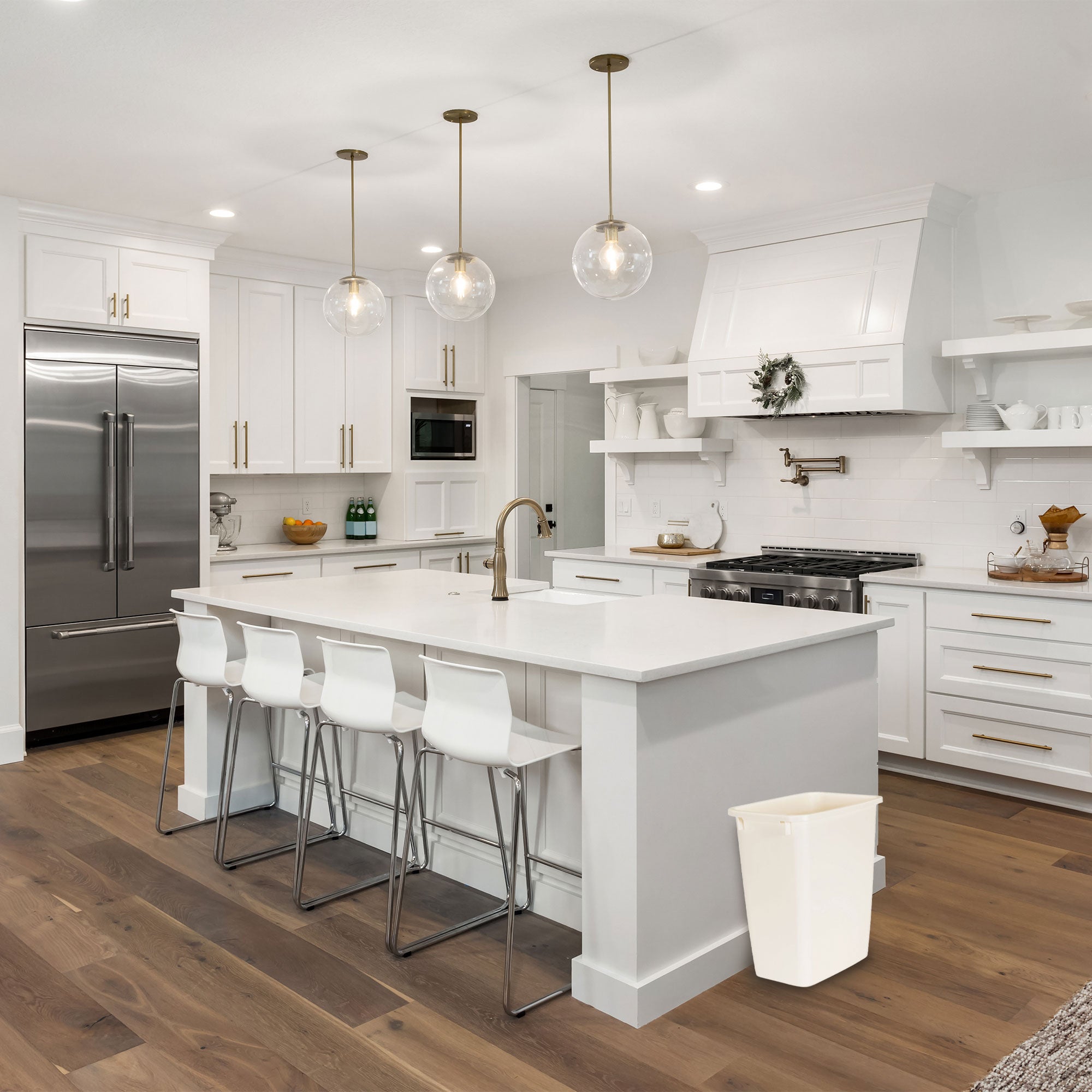 This trash can is attractive and simple. The clean white design fits in a variety of spaces and rooms, making it a great vanity wastebasket for bathrooms, kitchens, or home offices. This wastebasket is great for corners, bedsides a desk kitchen counter. The tough plastic design is durable and easy to clean, and to help keep it cleaner, you can easily line the trashcan with a small trash bag.