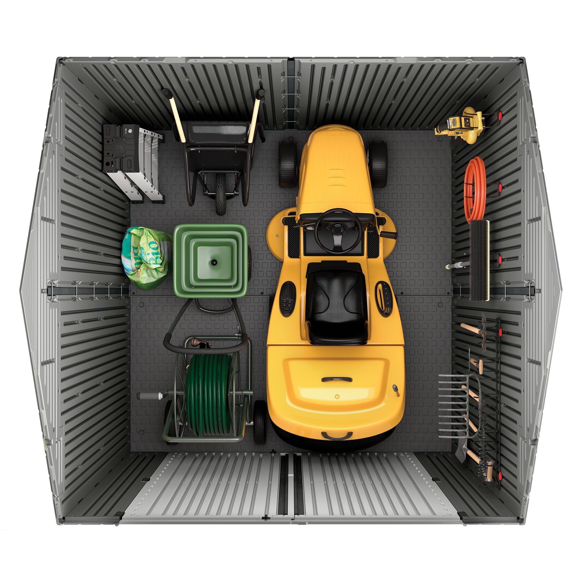 Give yourself the peace of mind you deserve and let your riding lawn mower, bikes, and gardening tools be stored safely with the 7 by 7-Foot Storage Shed from Rubbermaid.