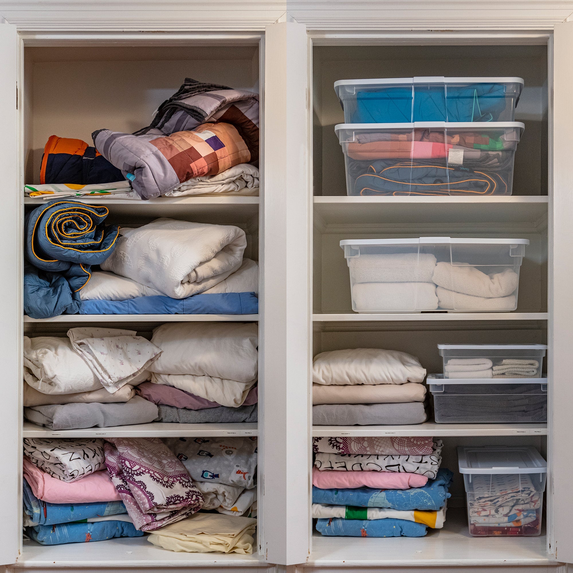 - From kitchen, pantry, and bedroom, these clear totes with white lid are good for organizing any are of your home for a clean, sleek look