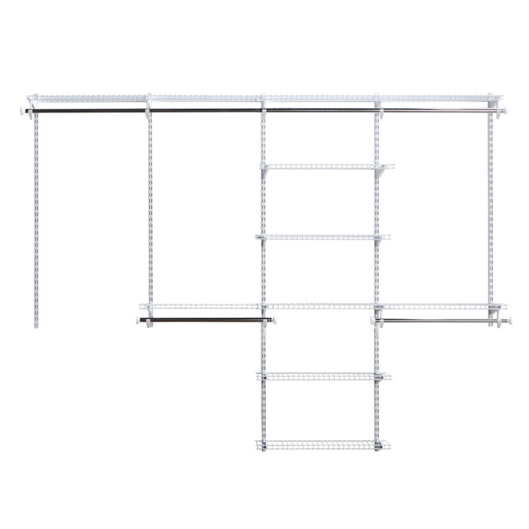 • Kit includes 5 shelves, 5 uprights, 2 48-inch hang rails, 4 rail covers, 2 inner and 2 outer clothes rods, 9 rod hangers, and all mounting hardware