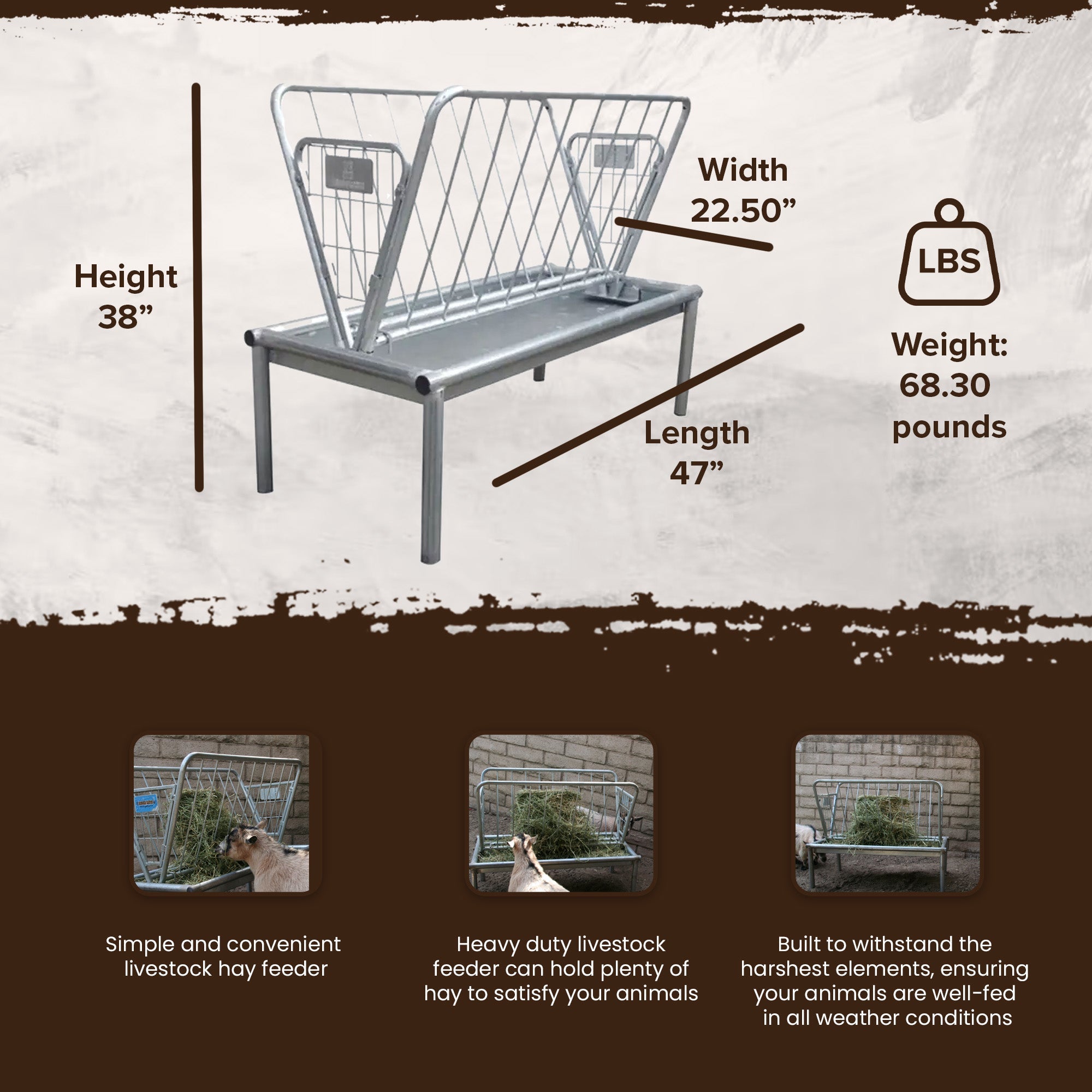 Featuring a compact yet spacious design, this heavy duty livestock feeder can hold plenty of hay to satisfy your animals' appetites. It's elevated for comfortable feeding, making it an ideal choice for sheep, goats, and miniature horses. The large, 6-inch-deep, extra-wide feed pan minimizes hay wastage by capturing loose hay, guaranteeing your animals enjoy every bite of their meals. Setting it up is simple; the hay feeder can be assembled in under 10 minutes using a simple 4-bolt assembly, allowing your animals to be fed within moments. Crafted from heavy duty galvanized steel, this livestock hay feeder is built to withstand the harshest elements, ensuring your animals are well-fed in all weather conditions. The hot-dipped galvanized steel catch pan is exceptionally durable, making it a standard choice for any environment and at any time of the day.
