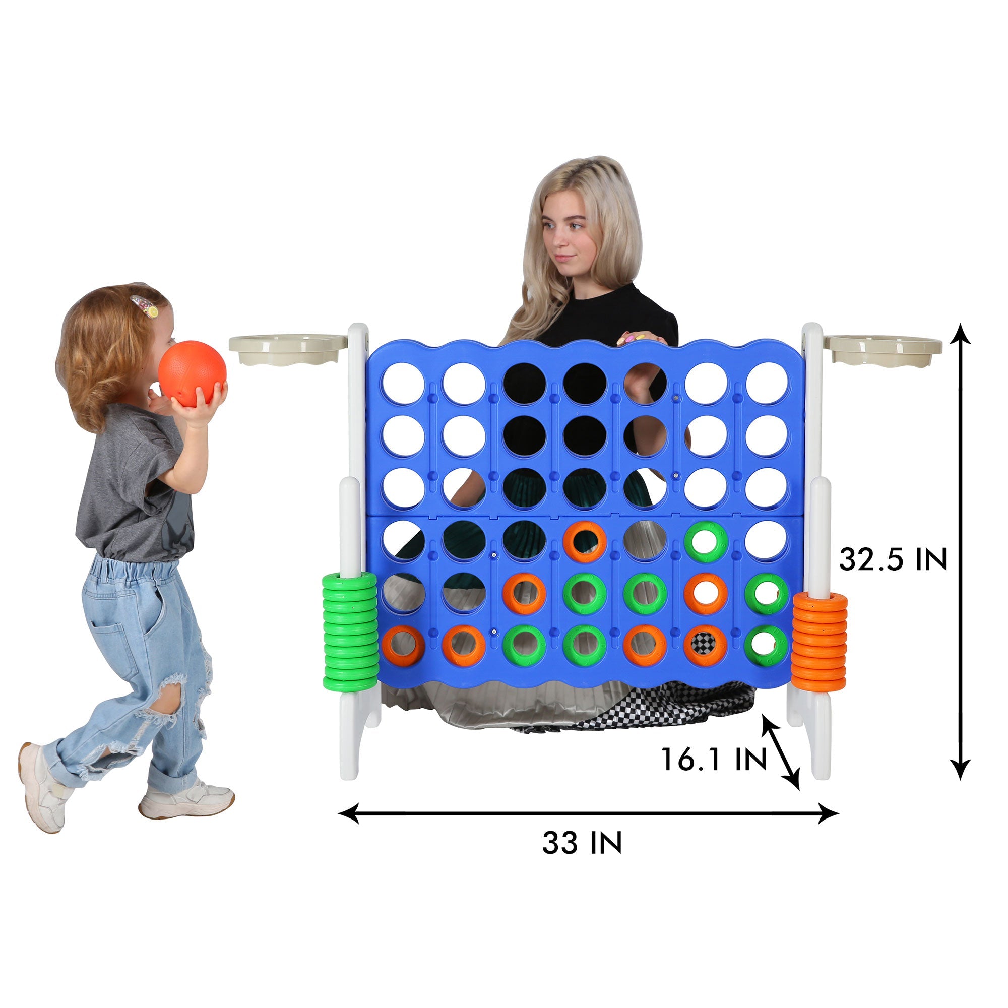 - Giant 4-In-A-Row connect game and basketball hoops provides a fun and educational yard activity great for parties and barbecues