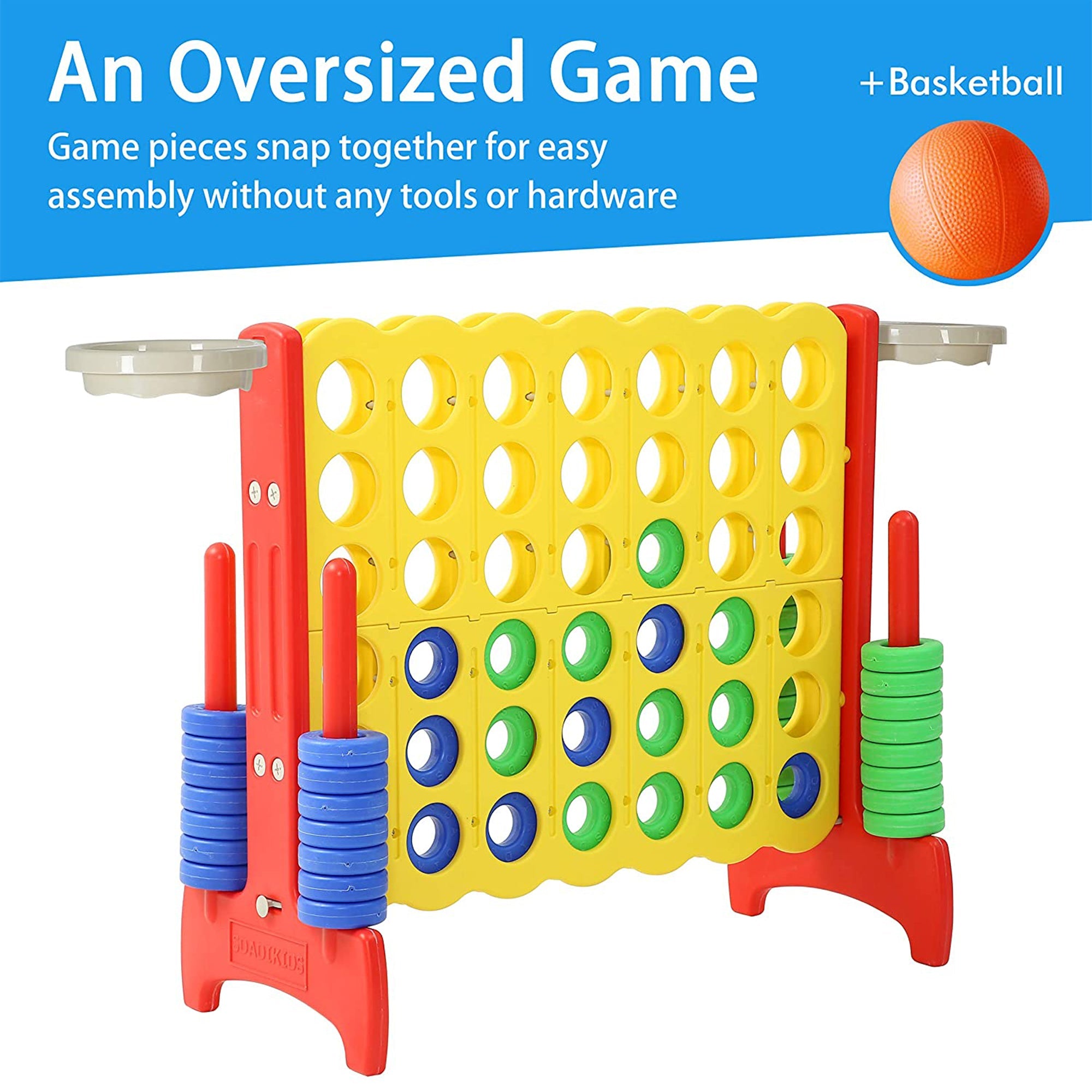 - Giant 4-In-A-Row connect game and basketball hoops provides a fun and educational yard activity great for parties and barbecues