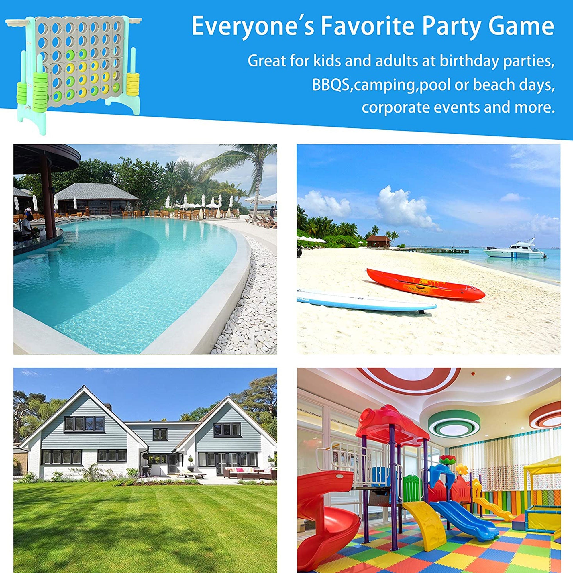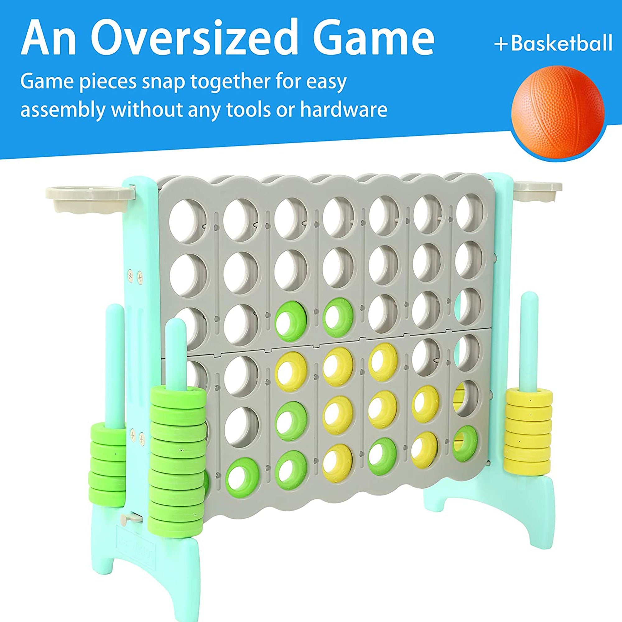 - Giant 4-In-A-Row connect game and basketball hoops provides a fun and educational yard activity great for parties and barbecues