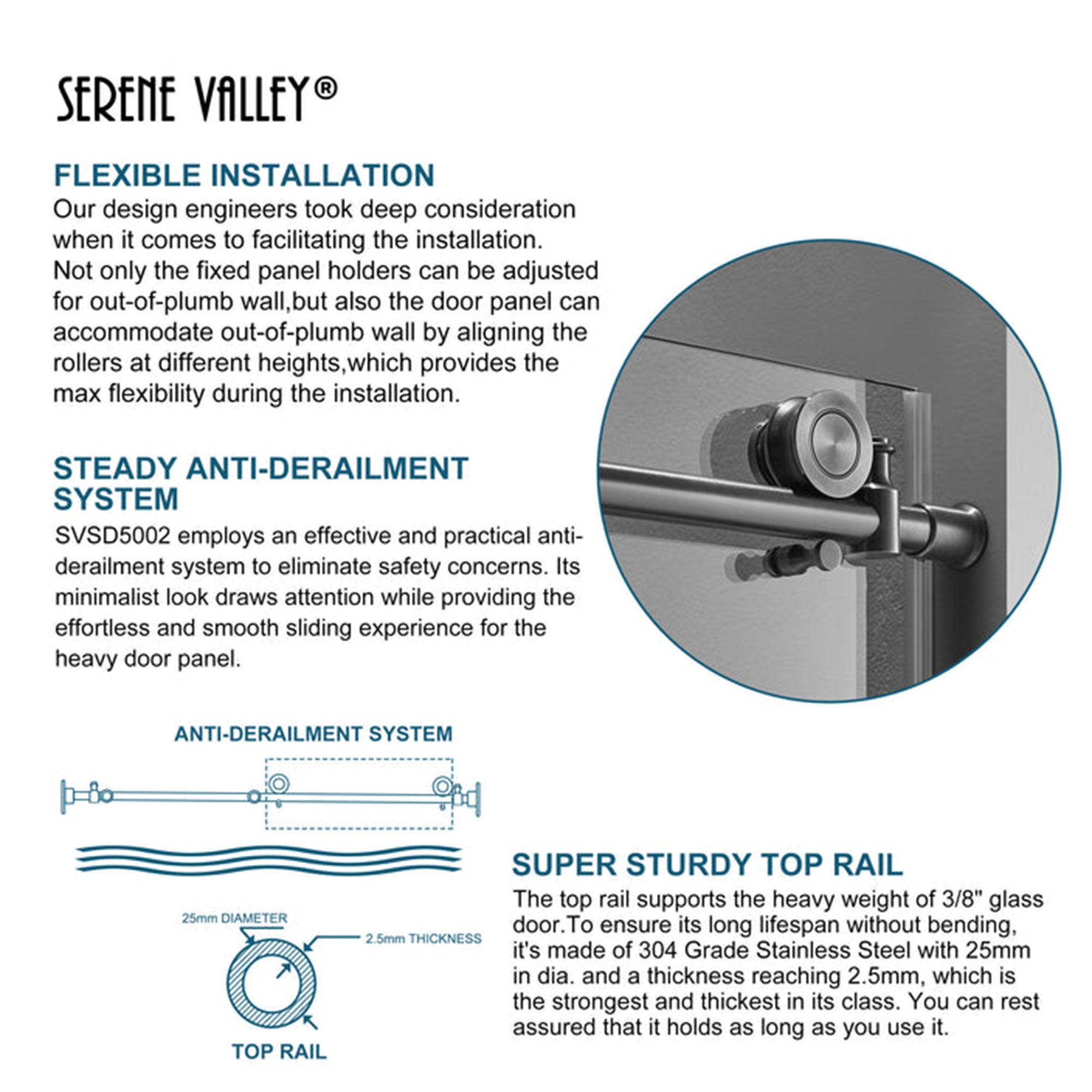 This system comes equipped with 4 heavy-duty stainless steel rollers for effortless sliding. These rollers can be mounted on your door panel and accommodate out-of-plumb walls by aligning at different heights, providing maximum flexibility during installation.