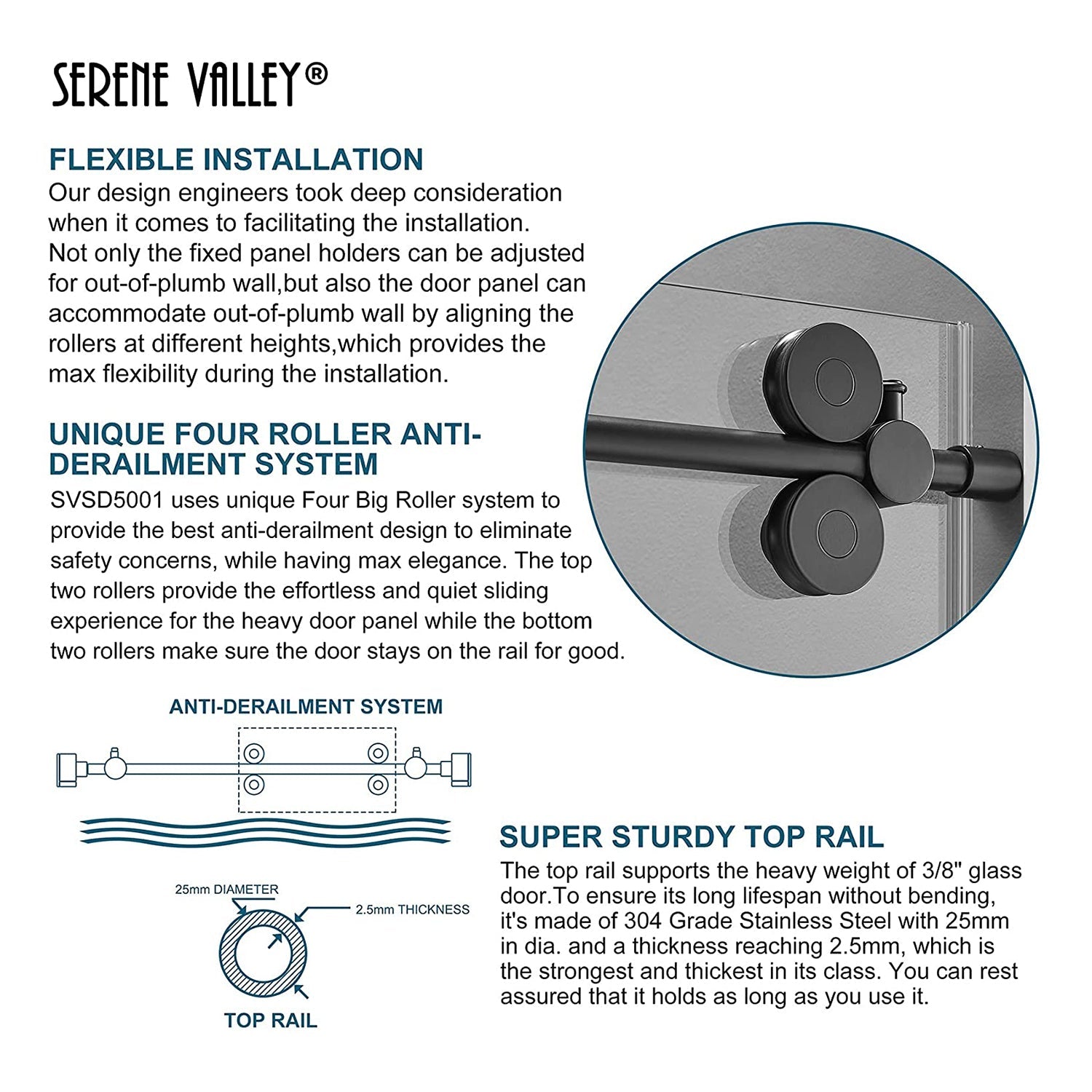 Serene Valley 60 x 74 Inch Big Roller Frameless Sliding Shower Door, Matte Black
