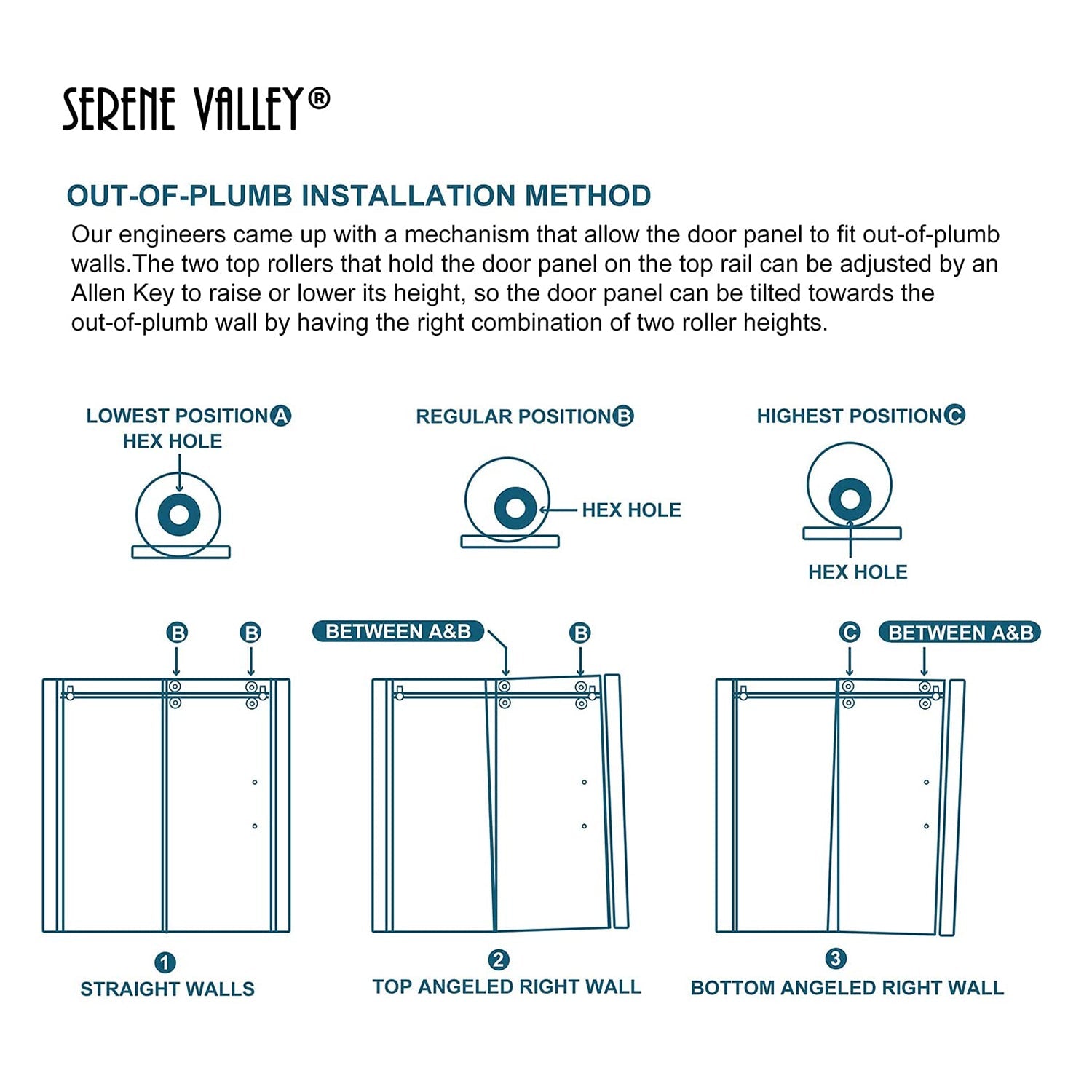 - Big rollers can be mounted on the door panel and adjusted up and down, allowing for a slight horizontal tilt to fit out-of-plumb walls
