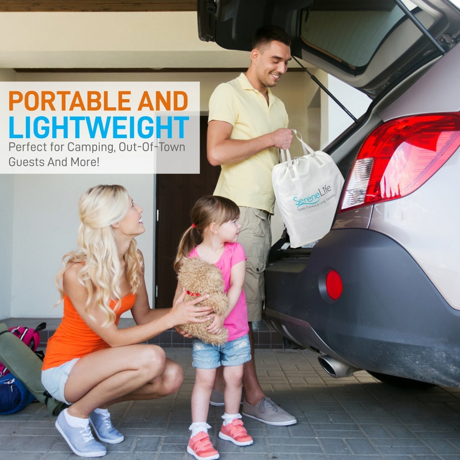 A mattress in an instant, the SereneLife Full Size Inflatable Premium Airbed Flocked Mattress 2 Pack is a perfect option to keep on hand for unexpected stay-over guests, comfortable camping, or as an emergency travel option.
