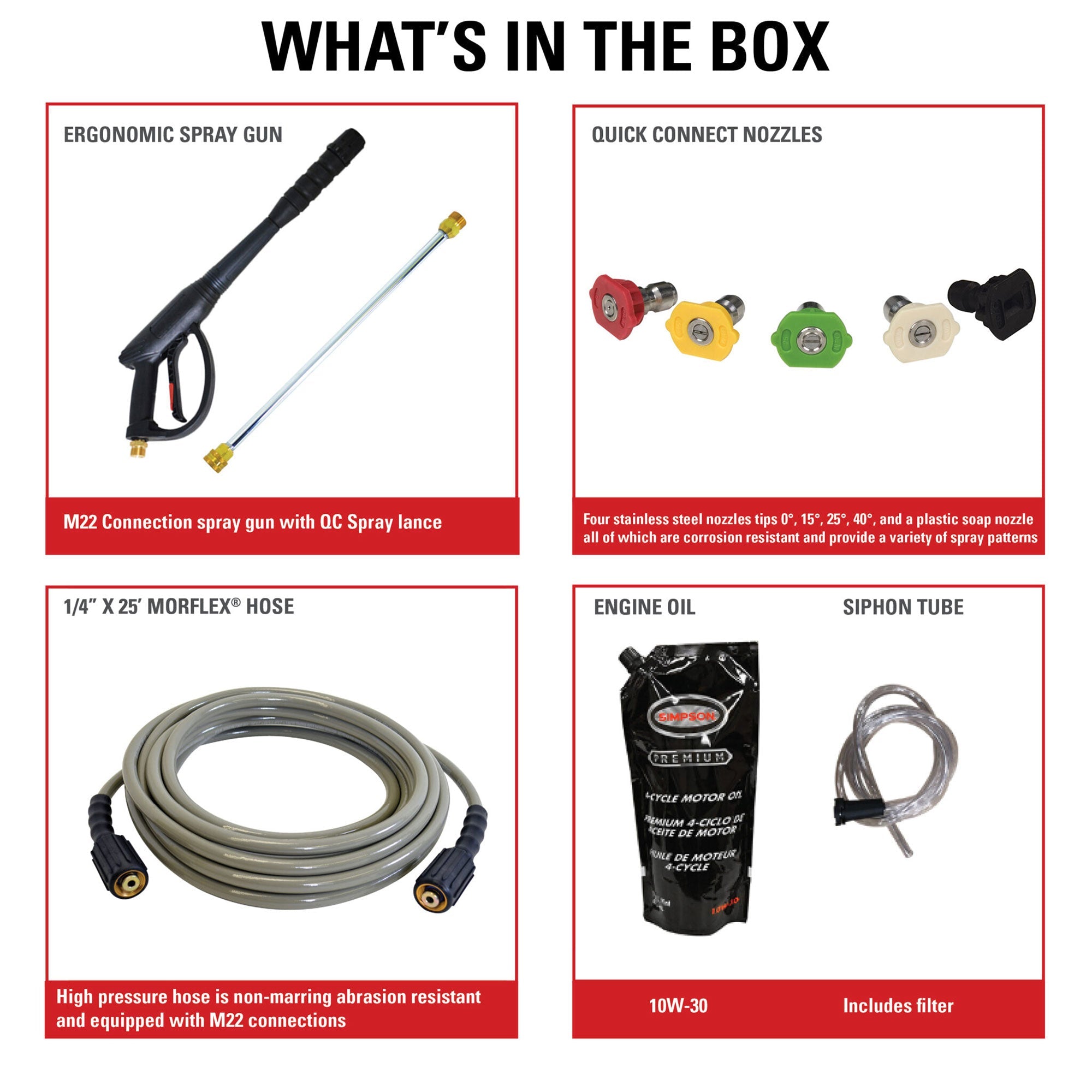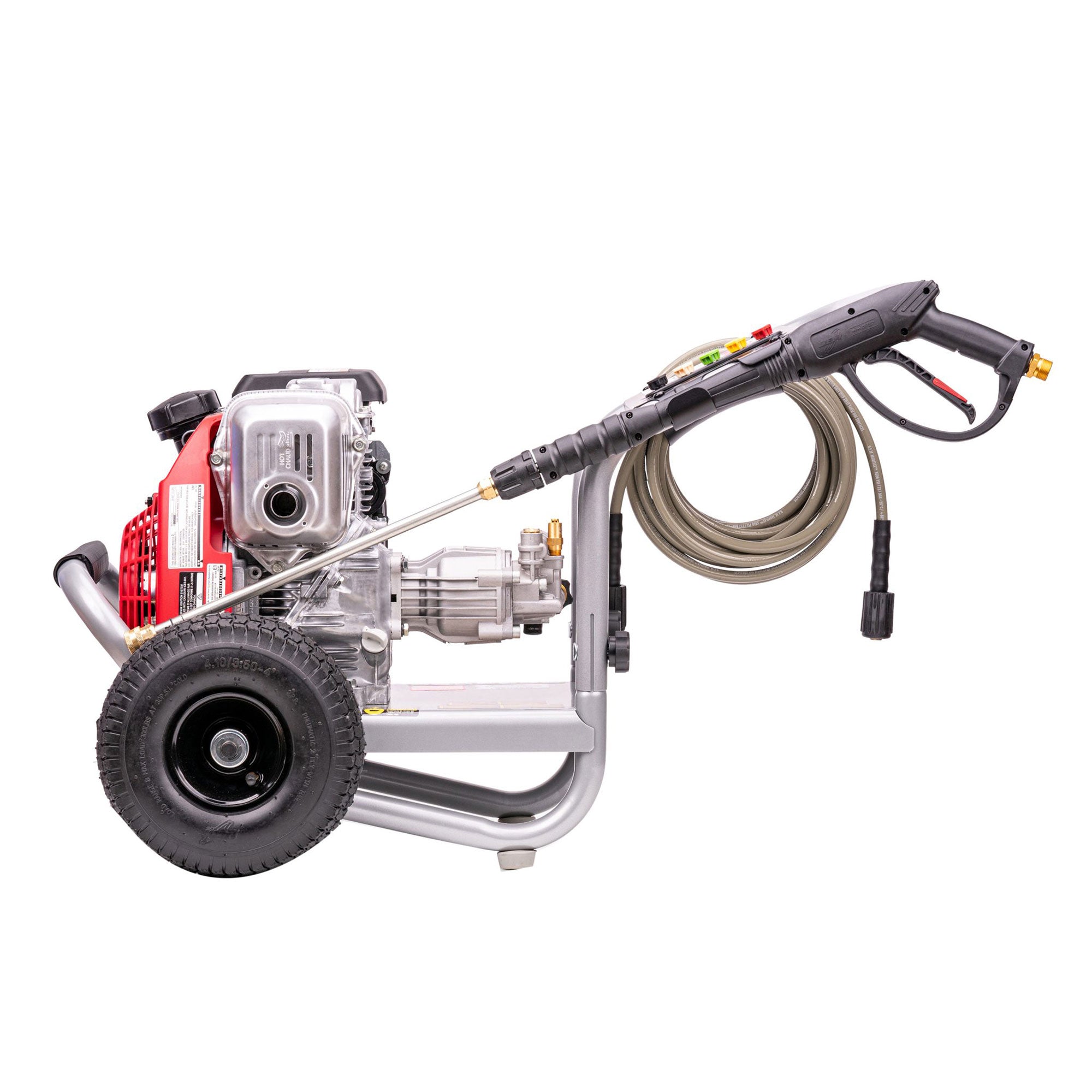 At the core of this robust unit lies a top-tier engine, renowned for its exceptional quality and unwavering reliability. The Honda GC190 stands out for its remarkable ease of starting and operation. In addition to the exceptional engine, this pressure washer features a hassle-free OEM Technologies Axial Cam Pump with thermal relief, ensuring continuous and reliable water pressure and flow to optimize your cleaning efforts. It comes complete with a 25-foot MorFlex high-pressure hose measuring 0.25 inches, a flexible and abrasion-resistant solution that won't leave marks and safeguards your surfaces during rigorous cleaning tasks. The unit's welded steel frame construction, complete with a powder-coated finish, guarantees long-lasting durability. Enhancing its maneuverability are the premium 10-inch pneumatic tires. As for its cleaning flexibility, this pressure washer offers five quick-connect nozzle options, ranging from 0 to 40 degrees, along with a soap nozzle.