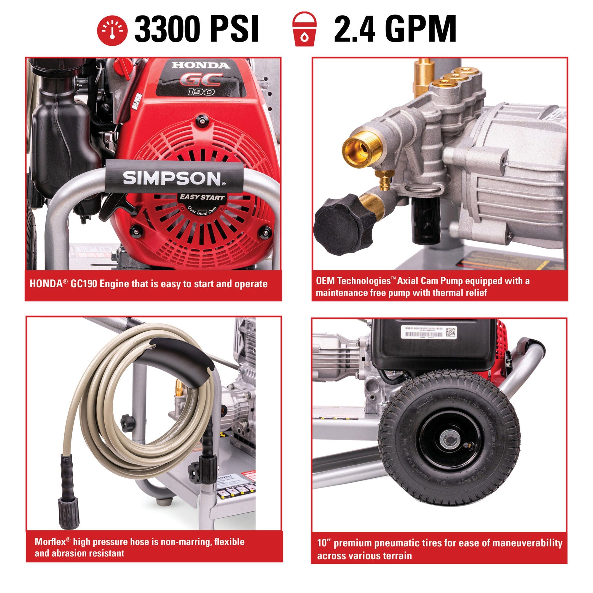 Whether you need a concentrated jet of water for tough stains or a wider spray for larger surface areas, this pressure washer has you covered. The Simpson Cleaning MegaShot 3300 PSI 2.4 GPM Pressure Washer is the ultimate choice for those who demand maximum performance without compromising quality or ease of use.