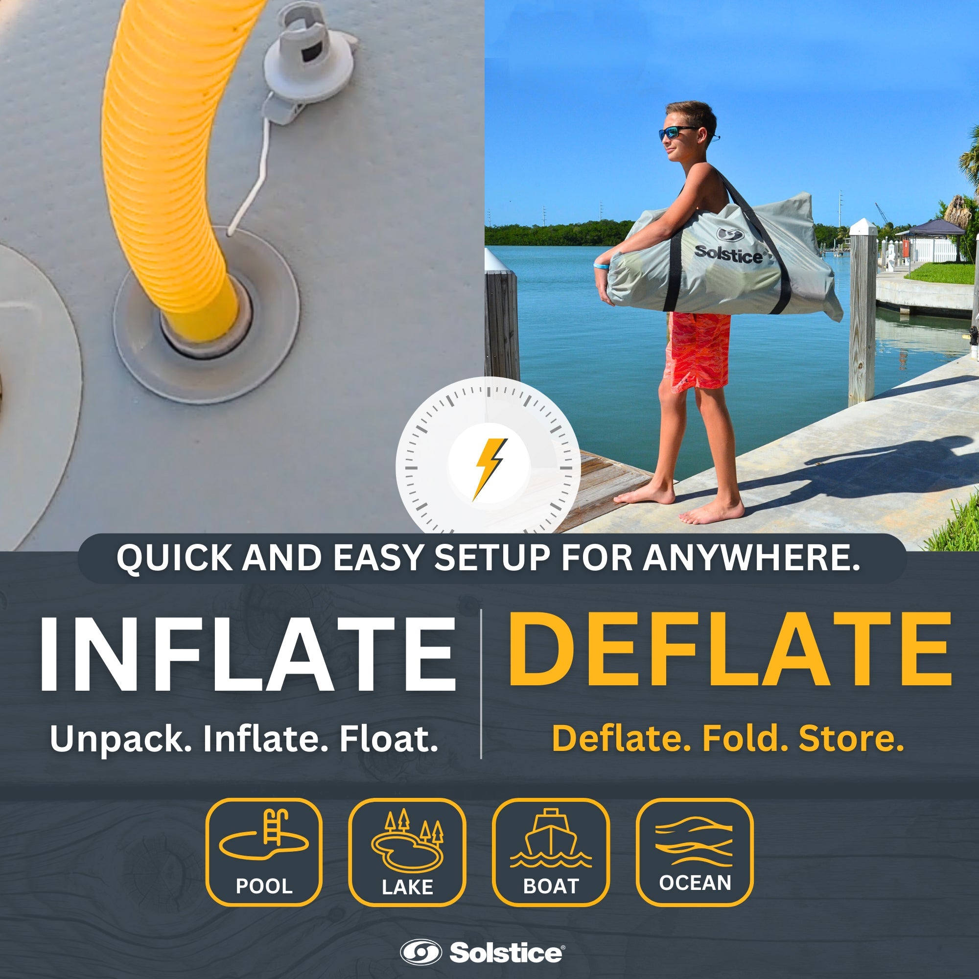 Solstice Inflatable Docks were invented with one goal in mind: to create a floating “home-base” on the water. Throw on some lounge chairs and a cooler, and you’ve created your own floating island to kick back with friends and family. Designed with military-grade PVC & our state-of-the-art dropstitch technology, our inflatable docks feel rigid when inflated, and are incredibly light & compact when folded up in its included carry bag. Solstice Inflatable docks are designed with reinforced grab handles, stainless steel D-ring tie-downs, and a high-pressure HR SOL-VALVE for quick inflation and deflation. Solstice recommended inflated pressure is between 7 and 10 PSI – use the included hand pump to reach your desired pressure.