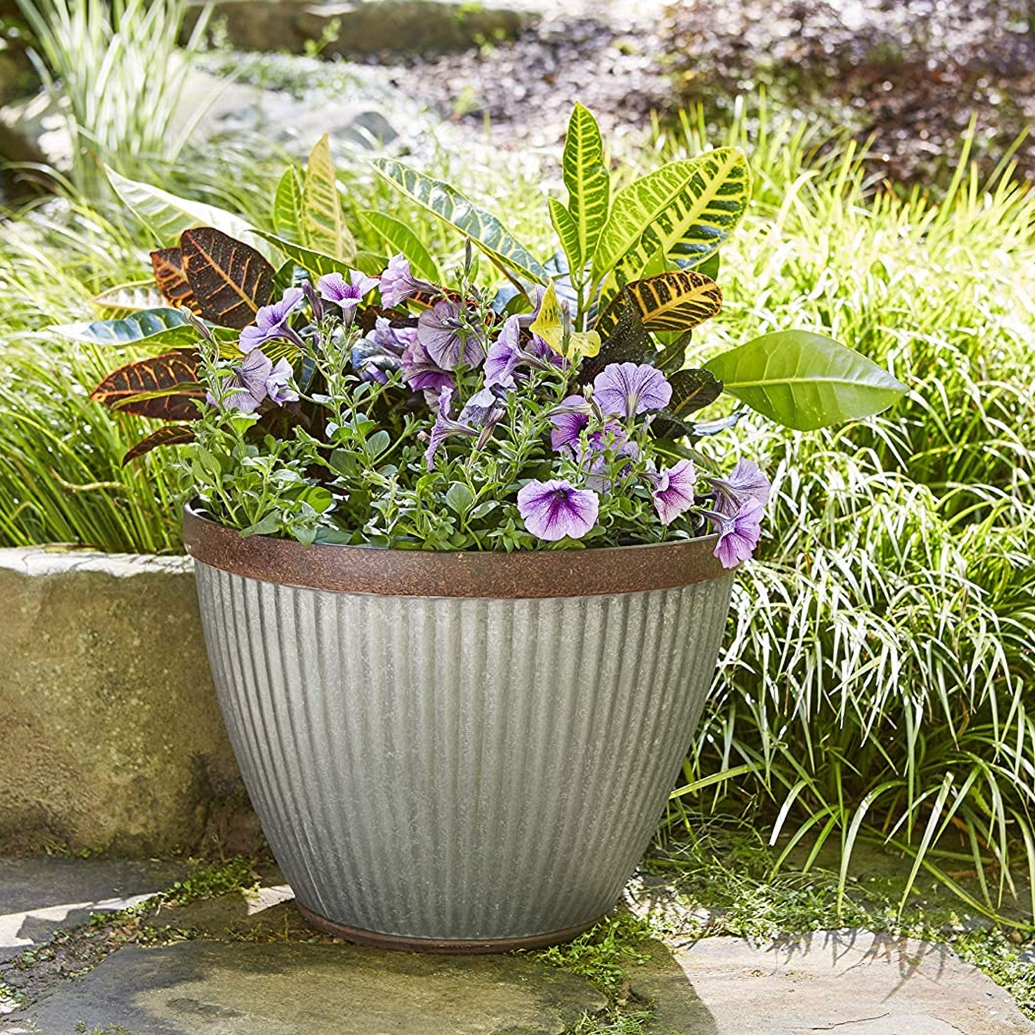 - Crafted from lightweight and durable resin with a corrugated look and faux galvanized finish