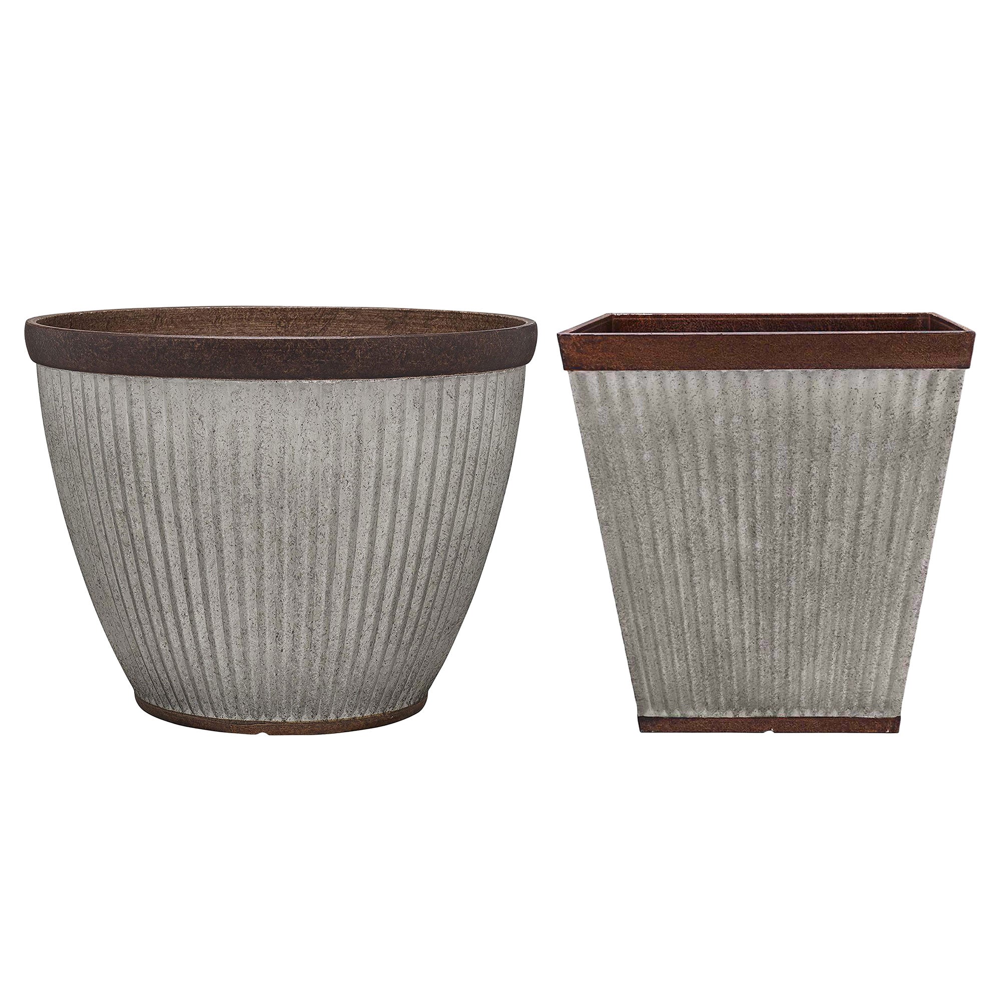 - Crafted from lightweight and durable resin with a corrugated look and faux galvanized finish
