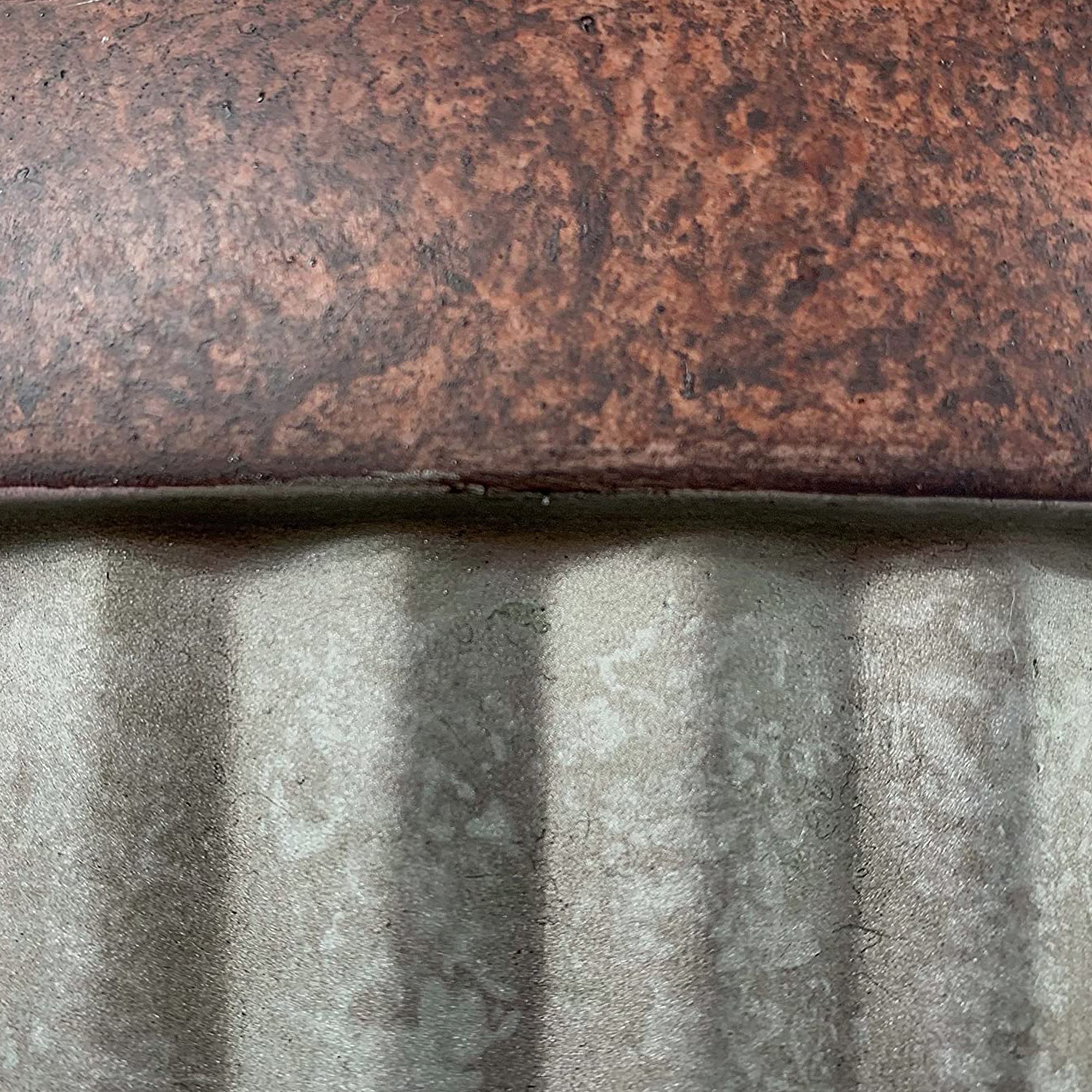 • Rustic pleated planter with weathered appearance of corrugated metal with a faux galvanized finish