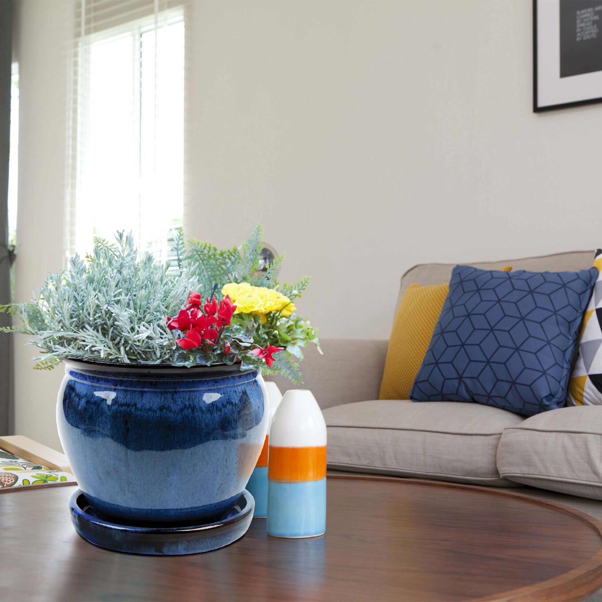 Southern Patio Wisteria 12 Inch Diameter Ceramic Planter Pot with Saucer, Blue