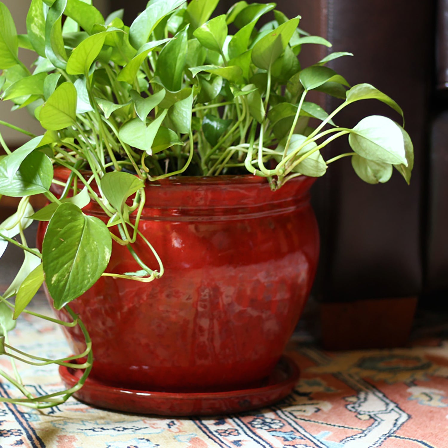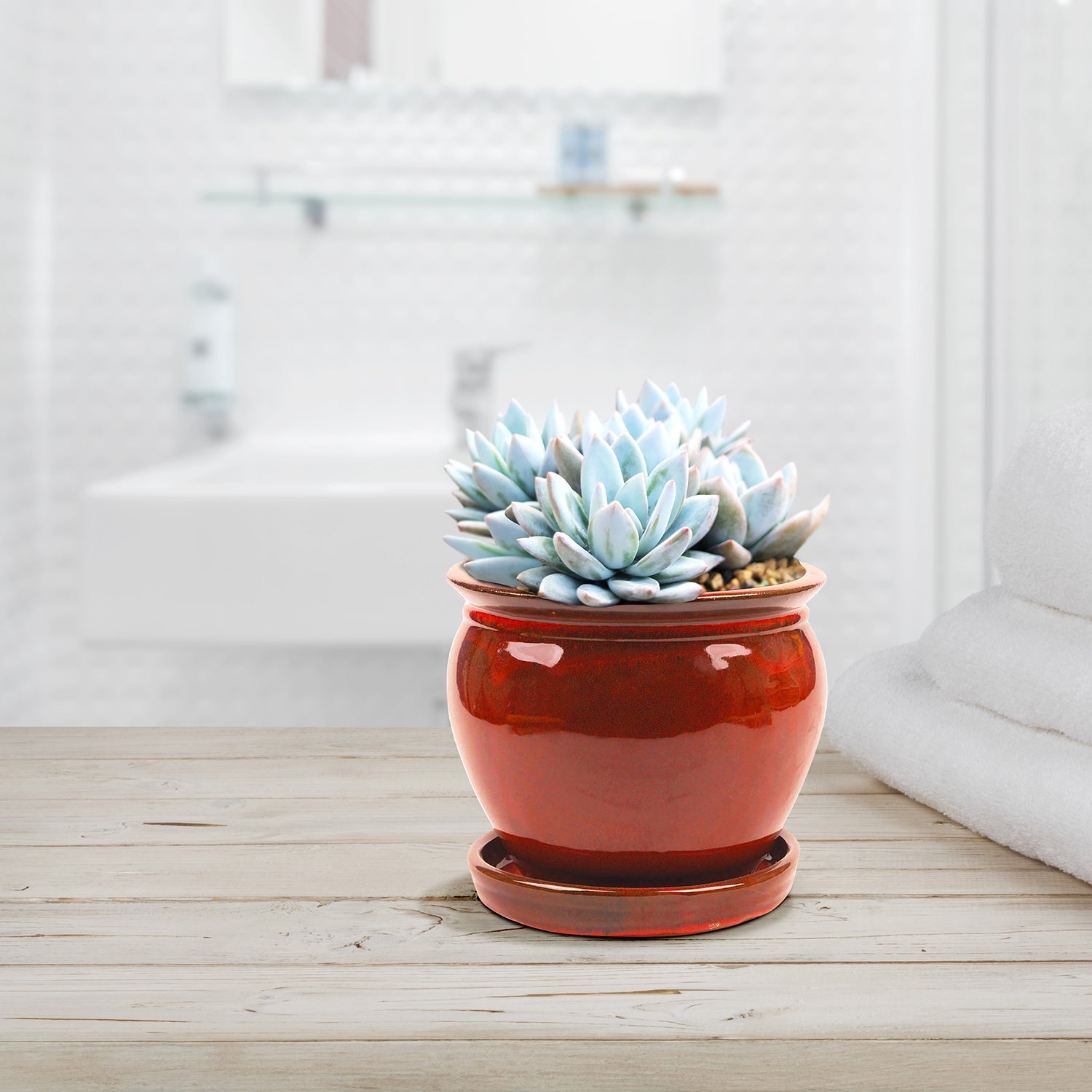 This desktop planter pot is handcrafted from thick ceramic that's light enough to easily move, but won't tip over accidentally. The pot boasts a rolled lip and a fired oxblood red glazed finish for a classic profile and a dazzling look. The saucer base helps prevent spills and has a rubber bottom to keep your surfaces safe from scratches and scuffs.