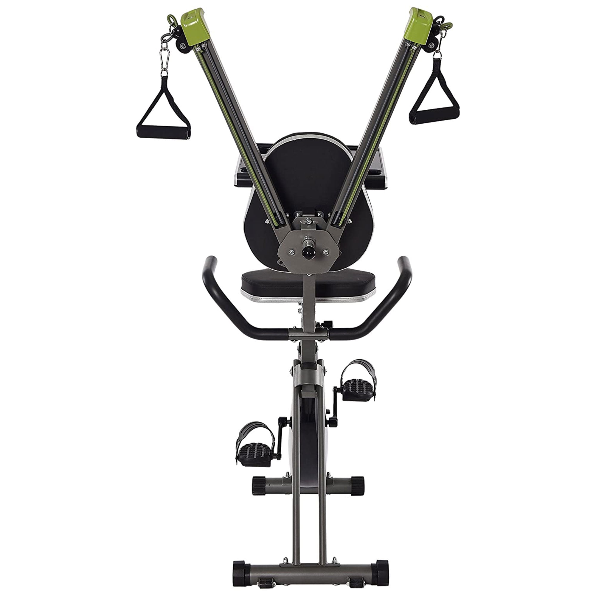 This device combines a standing desk with an exercise bike to provide an easy way to move throughout your day. The standing desk top measures 10 inches long by 17.25 inches wide and includes a laptop strap and drink holder so you can keep all your essentials close by. An adjustable prop allows you to read books or watch videos on your tablet hands-free while you move. With smooth and quiet magnetic pedaling tension, you can keep moving during video meetings or phone calls without distraction. Exercise your biceps, chest, back, and more with the upper body resistance strength system for an all-in-1 workout. With an adjustable design, simply unscrew the back pin and pull to change the height of the arms. This workstation measures 53.75 inches long, 20.5 inches wide, and 51.75 inches tall, making it the ideal size for home offices, living rooms, or any space you want to work.