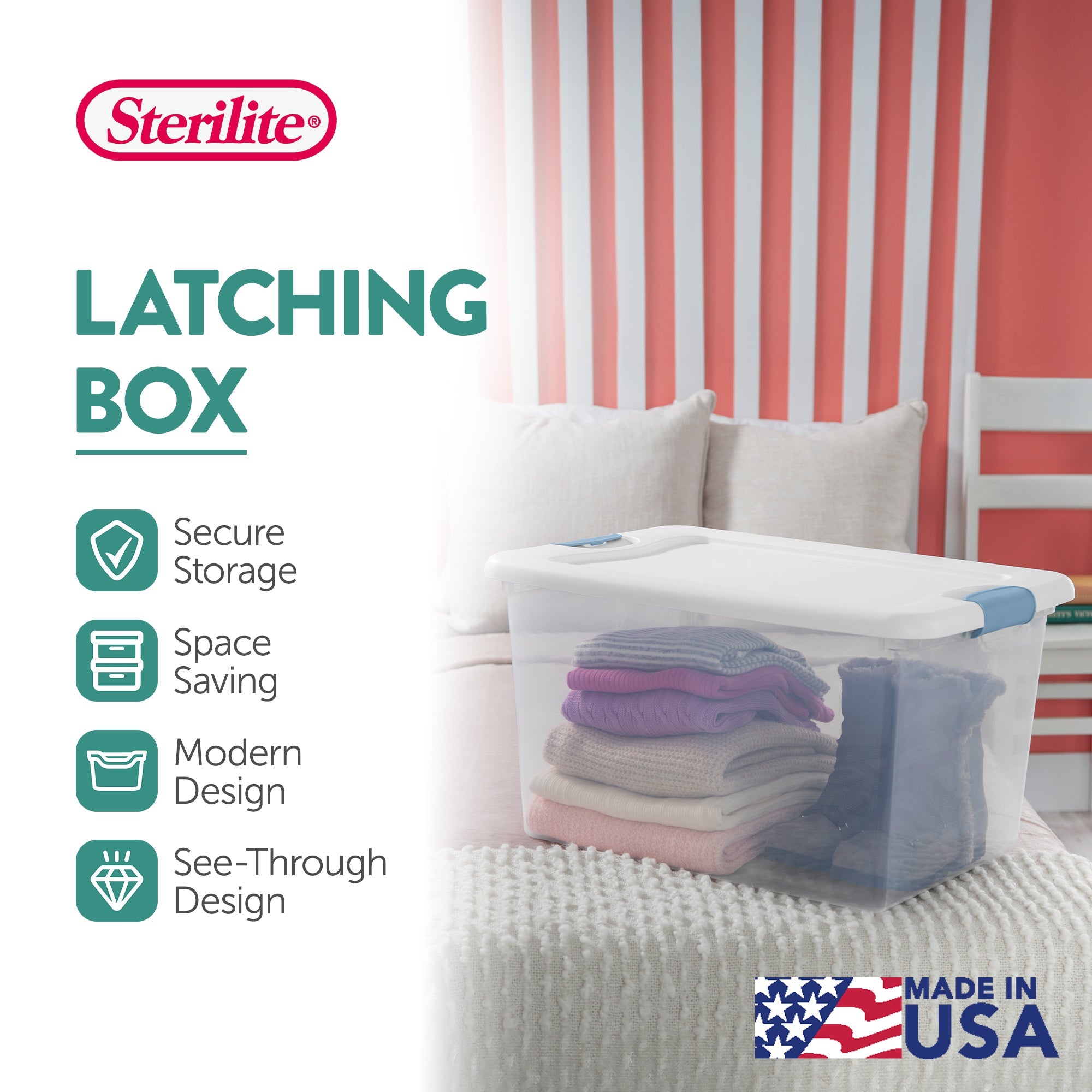 • Sterilite latch clip storage bin is the perfect size for blankets, sporting goods, small household tools, and supplies, with a clear base allowing quick viewing of contents