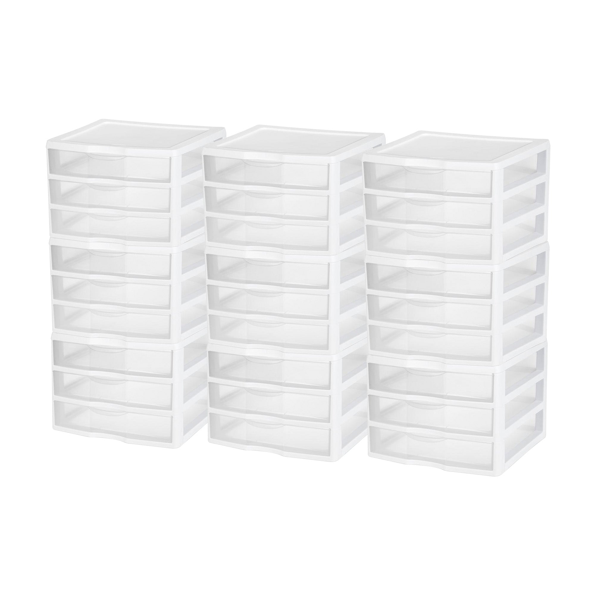This small storage unit is ideal for offices, bedrooms, bathrooms, and dorms. Maximize your storage space with the Sterilite Clear Plastic Stackable Small 3-Drawer Storage System, (9-Pack).