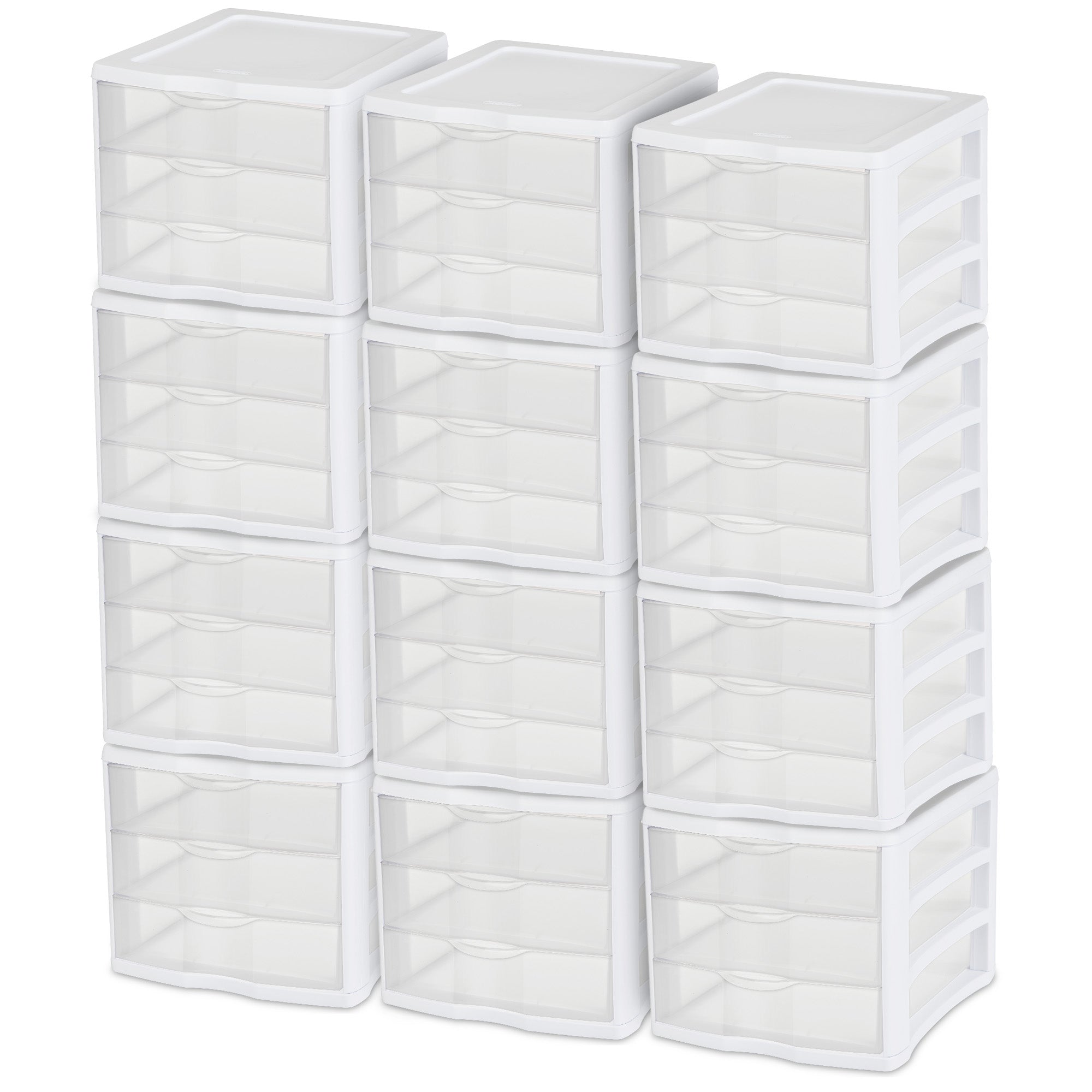 This small storage unit is ideal for offices, bedrooms, bathrooms, and dorms. Maximize your storage space with the Sterilite ClearView Plastic Stacking 3-Drawer Storage Organizer System, (12-Pack).